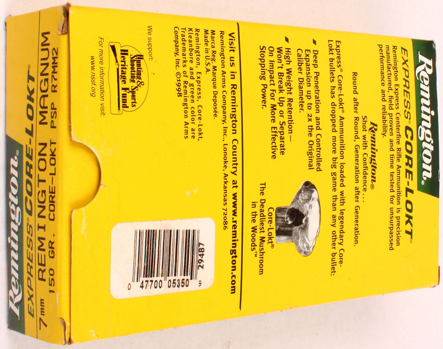Remington, Express Core-Lokt, 7mm REM MAG, 150 Gr. Core-Lokt PSP Bullet, green/yellow box with white/black/green print, box is solid with light wear, ammo is excellent. Grade: Excellent - Value: 30 to 60