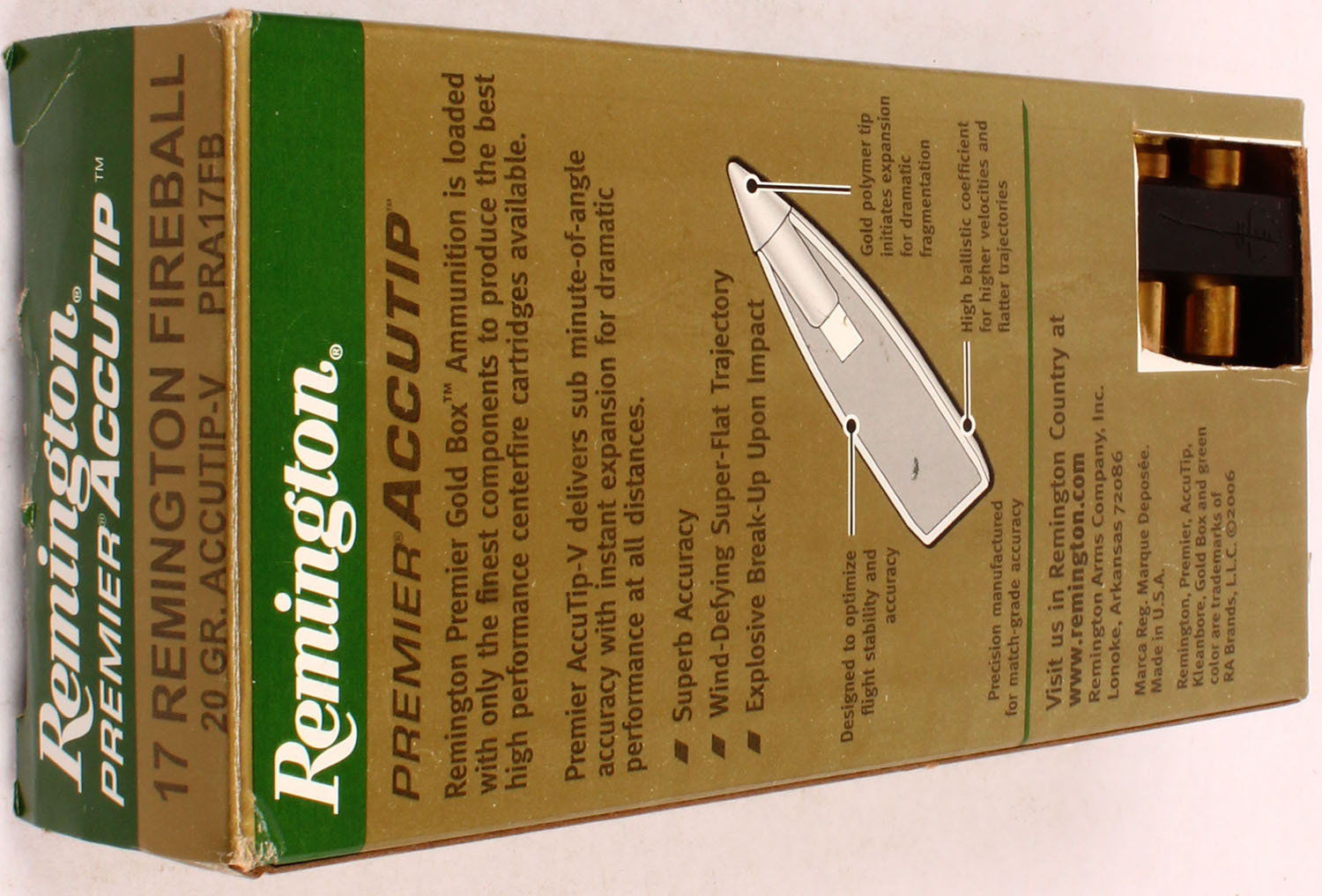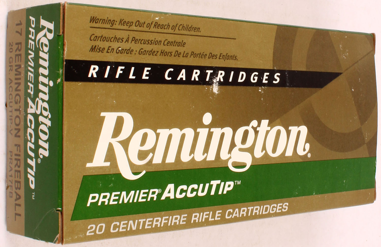 Remington, Premier AccuTip, .17 Remington Fireball, 20 Gr. Accutip-V Bullet, green/yellow box with white/black/green print, box is solid with light wear, ammo is excellent. Grade: Excellent - Value: 30 to 60