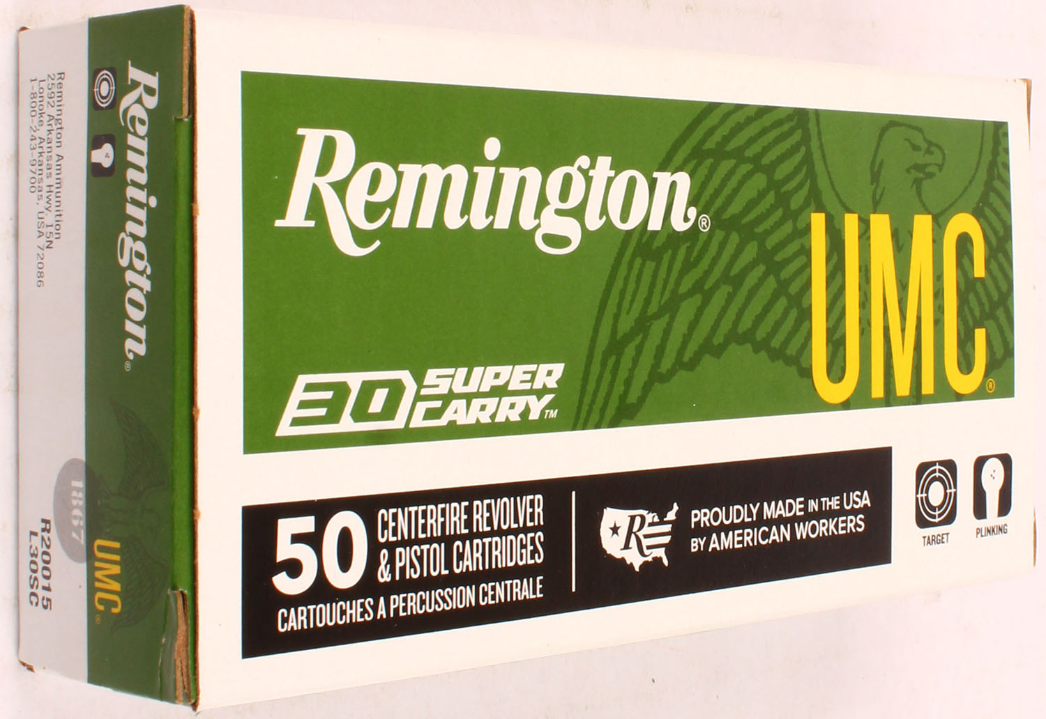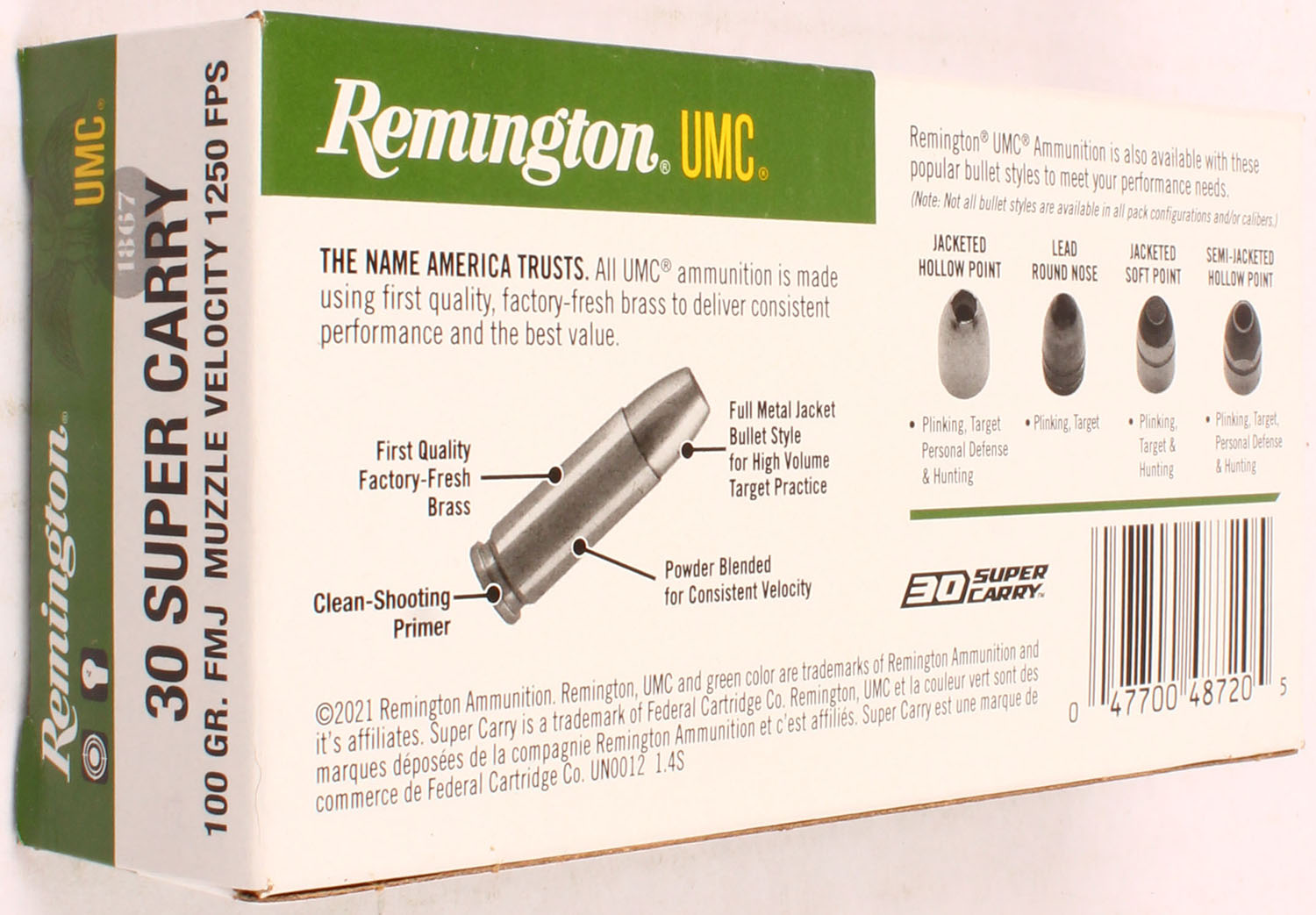 Remington, UMC, .30 Super carry, 100 Gr. FMJ, 1pc, Full, white/green box with white/yellow/black print, box is solid with no wear, ammo is MINT. Grade: MINT - Value: 30 to 60