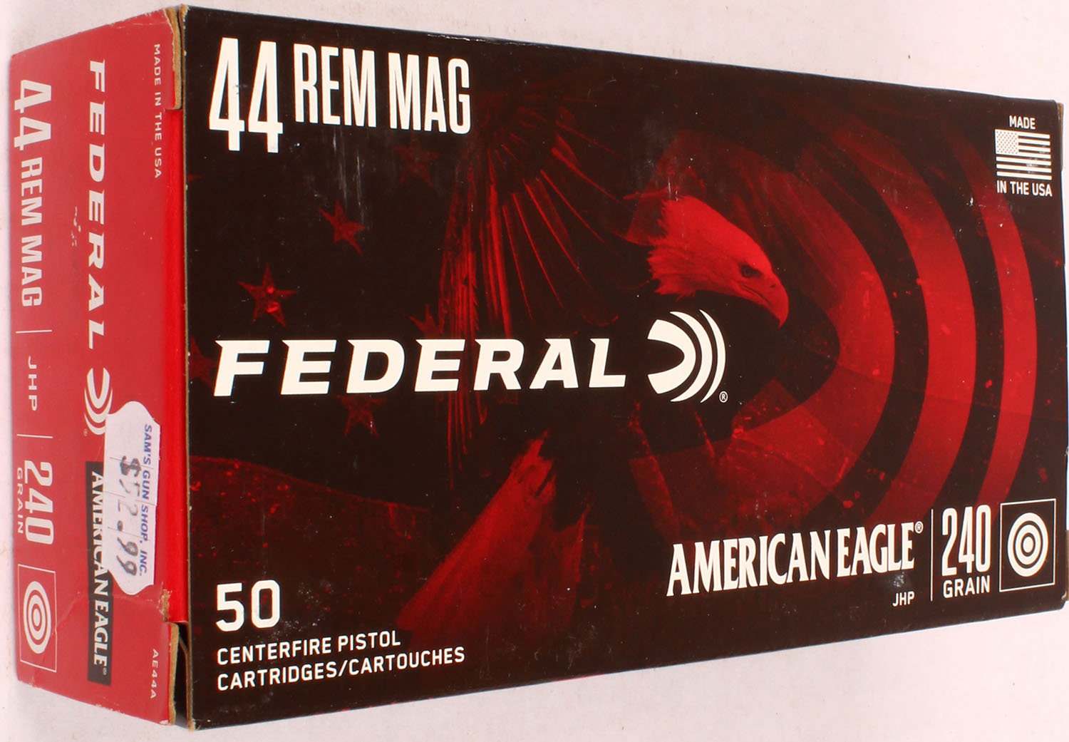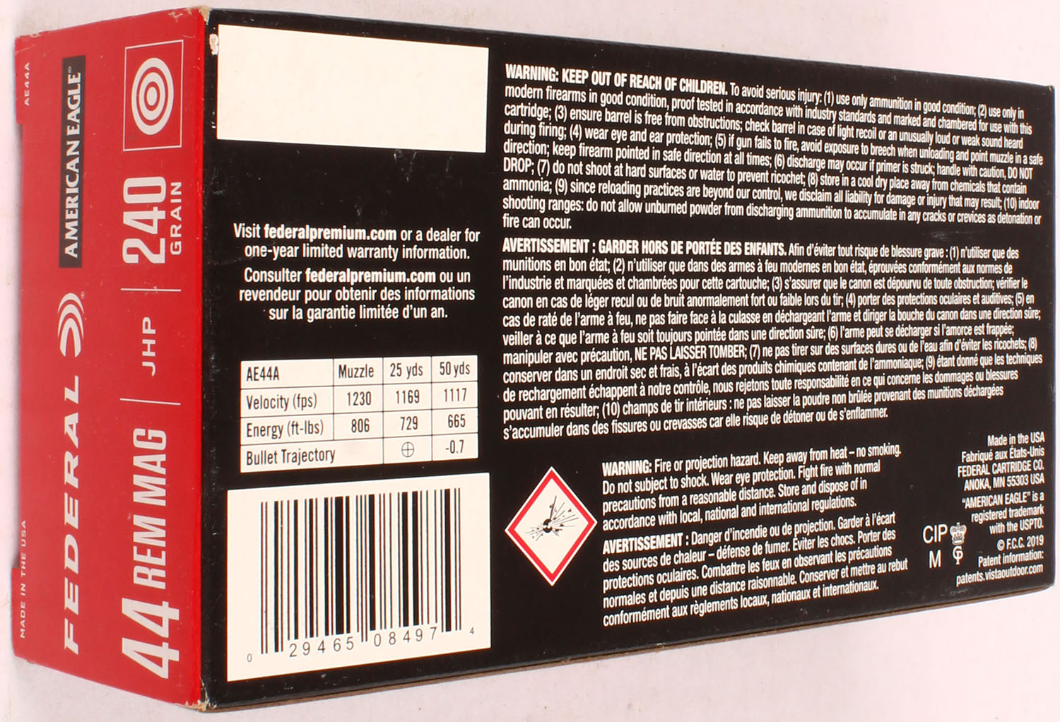 Federal, American Eagle, 44 Rem Mag JHP, 240 Grain, Full, 1pc. multi-colored box, box is solid with excellent color, Ammo is excellent. Grade: Excellent ++ - Value: 20 to 60