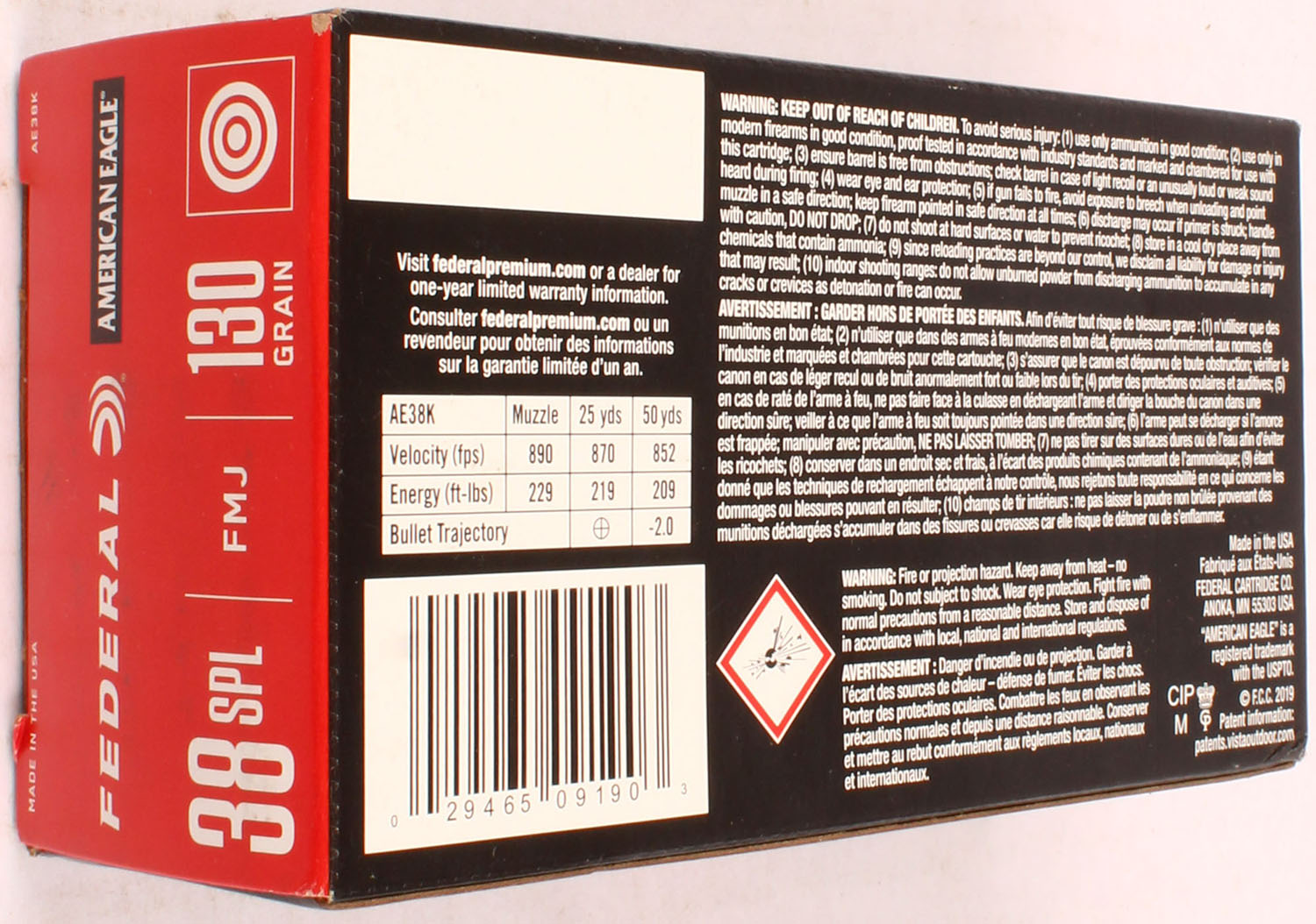 Federal, American Eagle, 38 SPL FMJ, 130 Grain, Full, 1pc. multi-colored box, box is solid with excellent color, Ammo is excellent. Grade: Excellent ++ - Value: 20 to 60