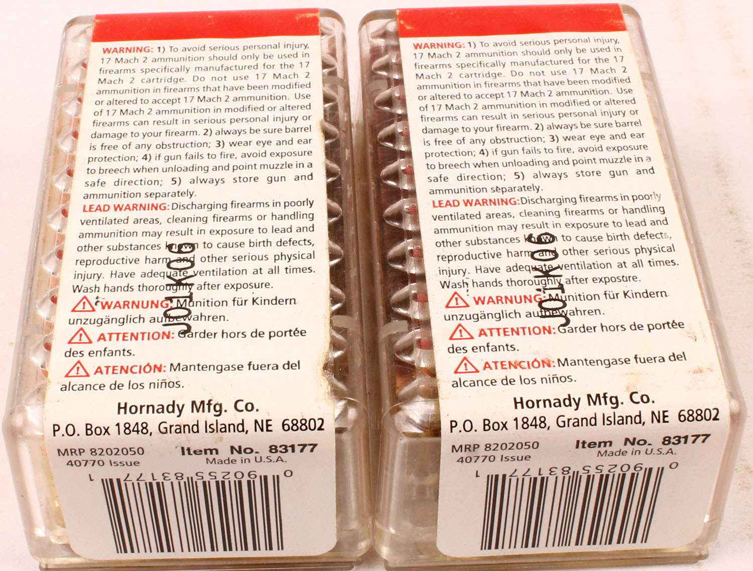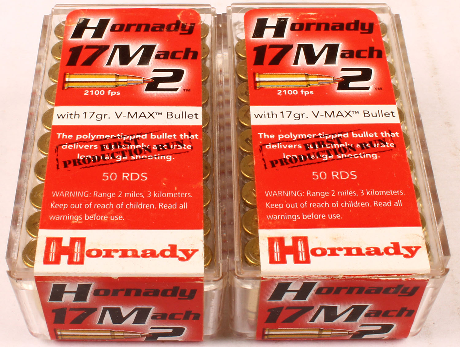 Lot of 2 Hornady, 17 Mach 2 with over stamp stating ''First Production Run'', 17 Grain V-Max, FULL & SEALED, 1pc. multi-colored box, box is solid with excellent color, Ammo is excellent. Grade: Excellent ++ - Value: 10 to 60