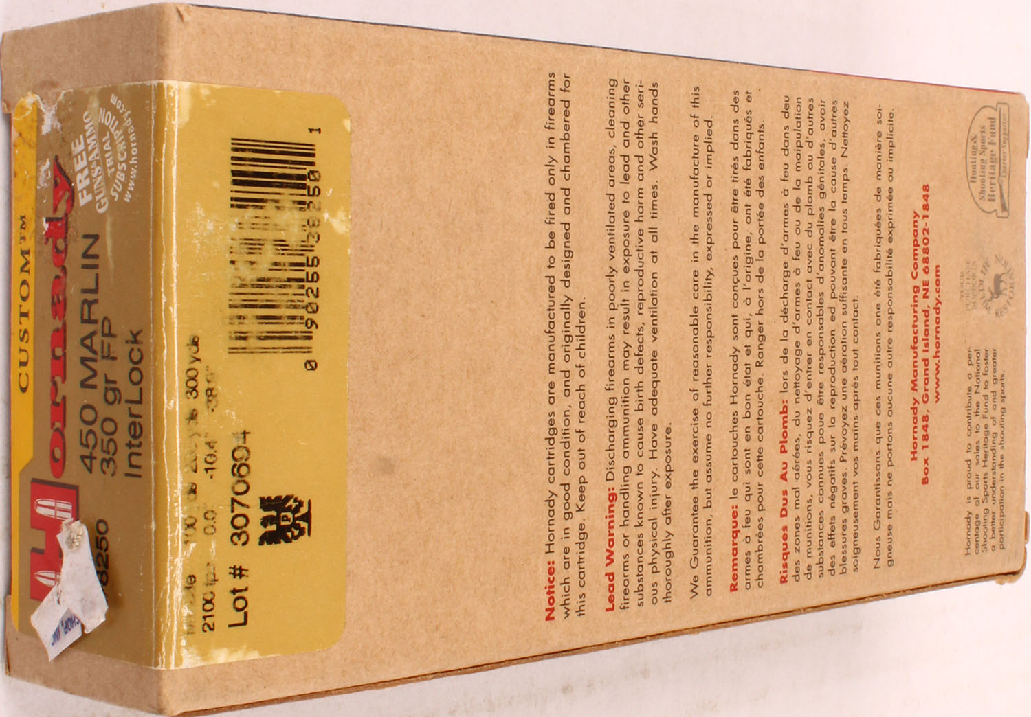 Hornady, Custom, 450 Marlin, 350 Grain FP InterLock, Full, 1pc. multi-colored box, box is solid with excellent color, Ammo is excellent. Grade: Excellent + - Value: 20 to 60