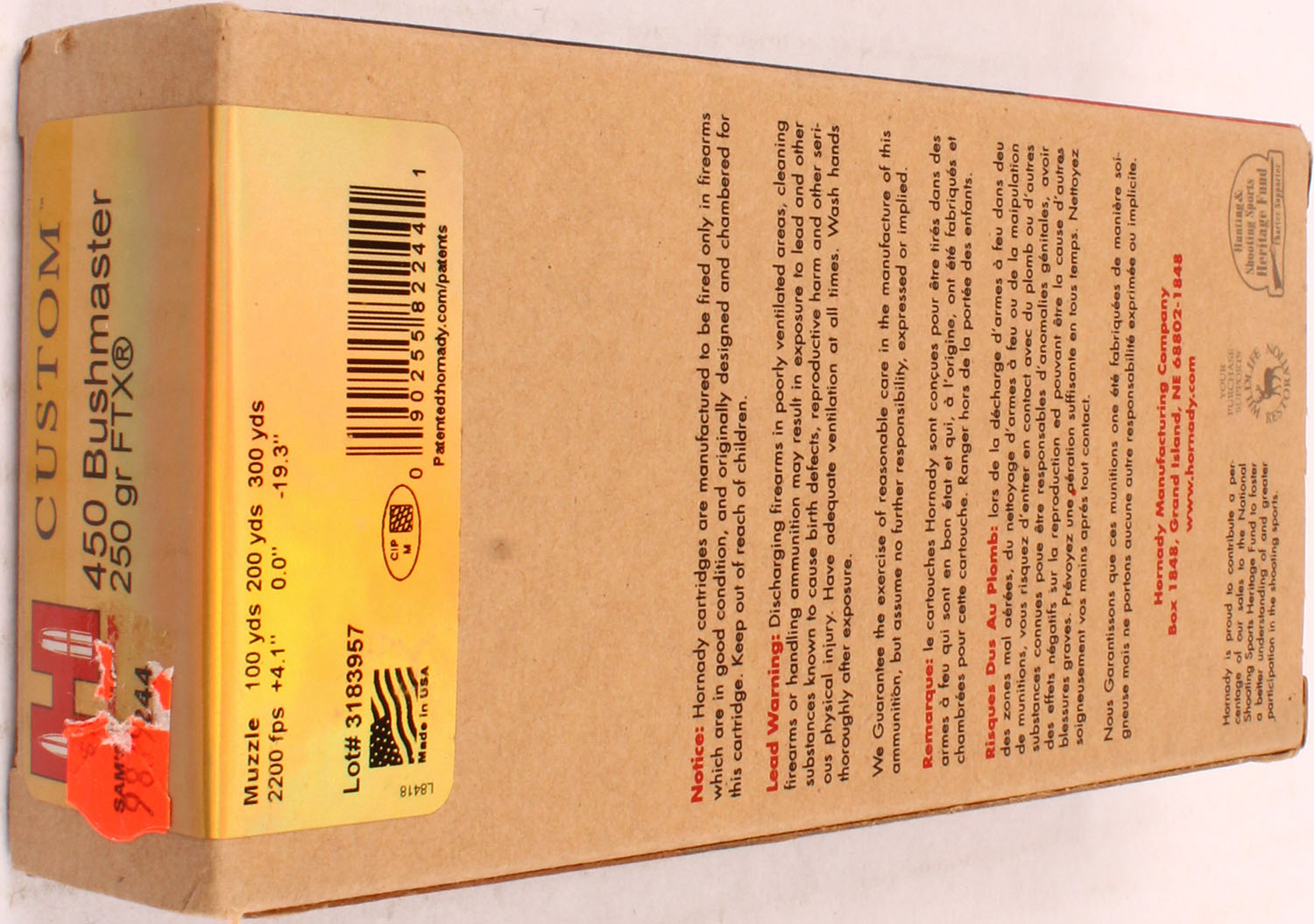 Hornady, Custom, 450 Bushmaster, 250 Grain FTX, Full, 1pc. multi-colored box, box is solid with excellent color, Ammo is excellent. Grade: Excellent ++ - Value: 20 to 60