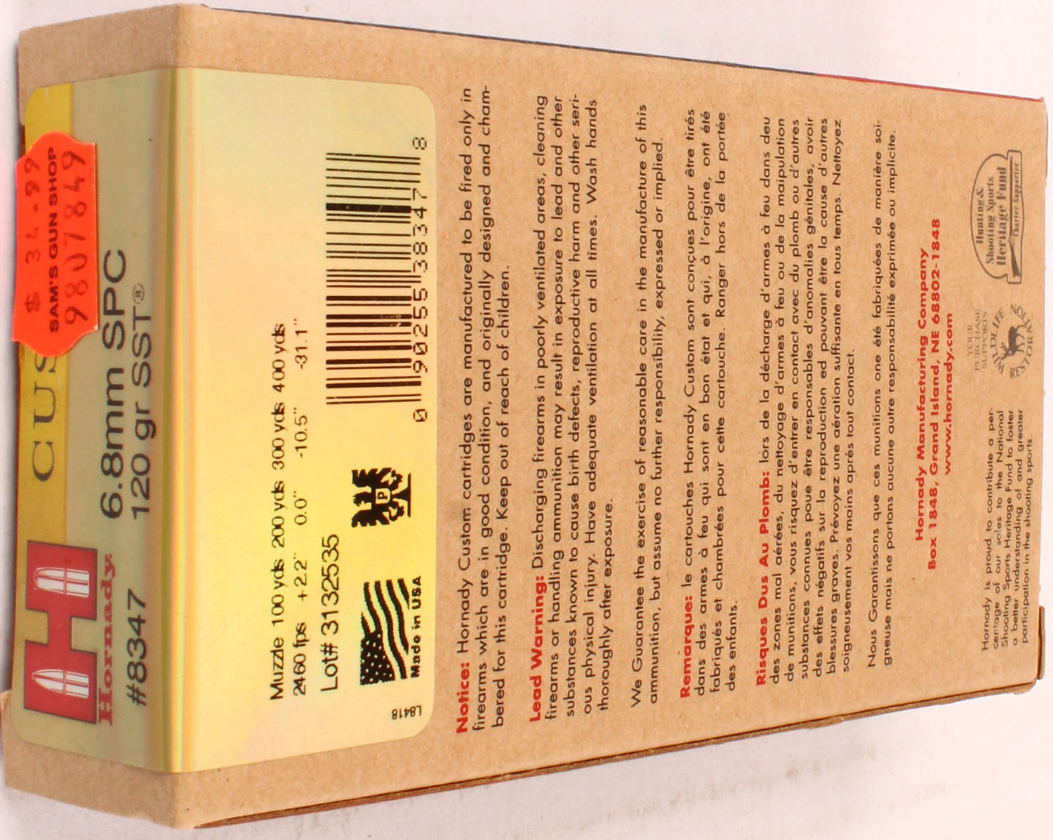 Hornady, Custom, 6.8mm SPC, 120 Grain SST, Full, 1pc. multi-colored box, box is solid with excellent color, Ammo is excellent. Grade: Excellent ++ - Value: 20 to 60