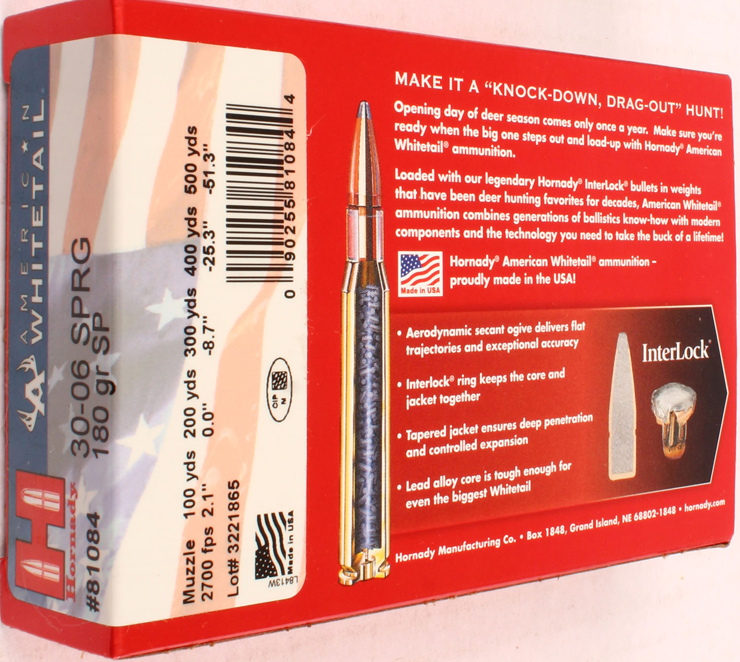 Hornady, American Whitetail, 30-06 SPRG, 180 Grain SP, Full, 1pc. multi-colored box, box is solid with excellent color, Ammo is excellent. Grade: Excellent ++ - Value: 20 to 60