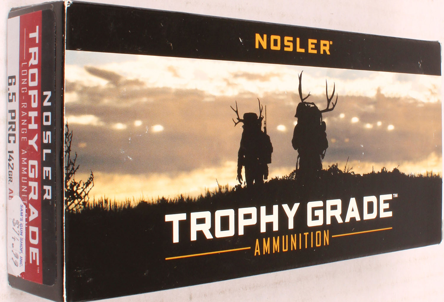 Nosler, Trophy Grade, 6.5 PRC, 142 Grain ABLR, Full, 1pc. multi-colored box, box is solid with excellent color, Ammo is excellent. Grade: Excellent ++ - Value: 20 to 80