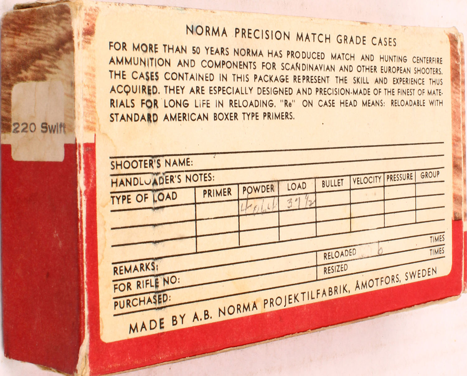 Norma, 220 Swift, Primed Brass, Full, 1pc. multi-colored box, box is solid with very nice color, Ammo is excellent. Grade: Excellent - Value: 20 to 60