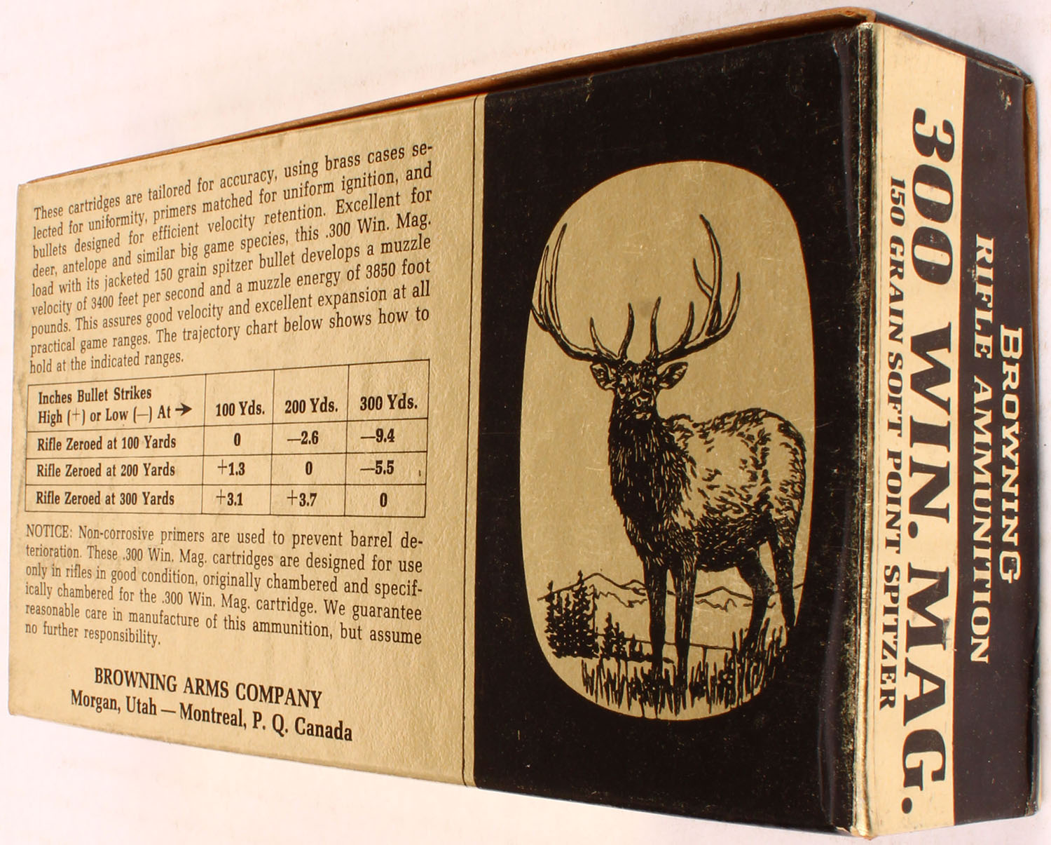 Browning with Insert, 300 Win Mag, 150 Grain Soft Point Spitzer, Full, 1pc., multi-colored box, box is solid with light shelf wear, Ammo is excellent. Grade: Excellent + - Value: 20 to 80