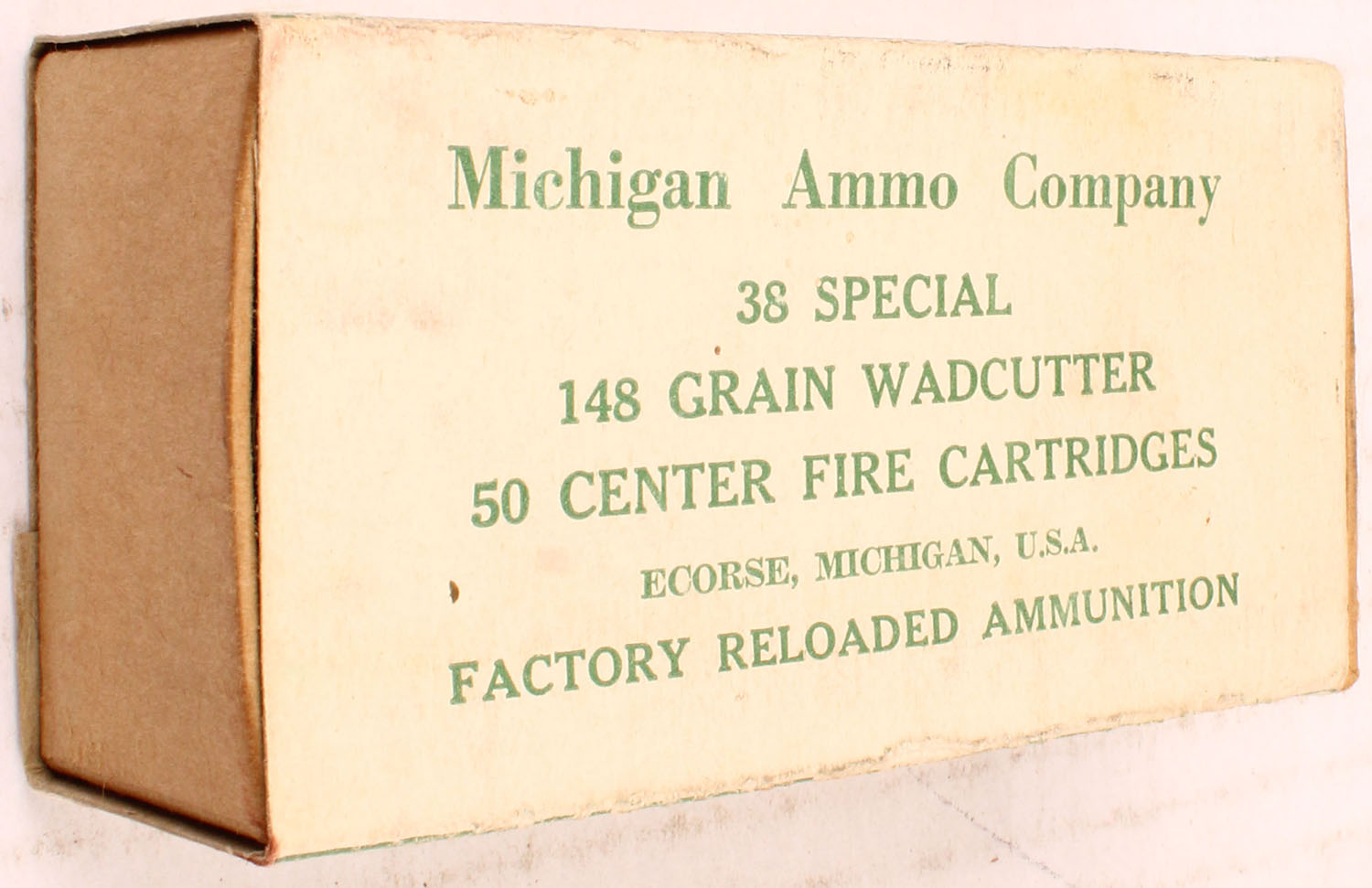 Michigan Ammo Company, .38 Special, 148 Gr. Wadcutter, 1pc, full of lead RN bullets, white box with green print, box is solid rub marks, ammo is excellent. Grade: Excellent - Value: 30 to 60