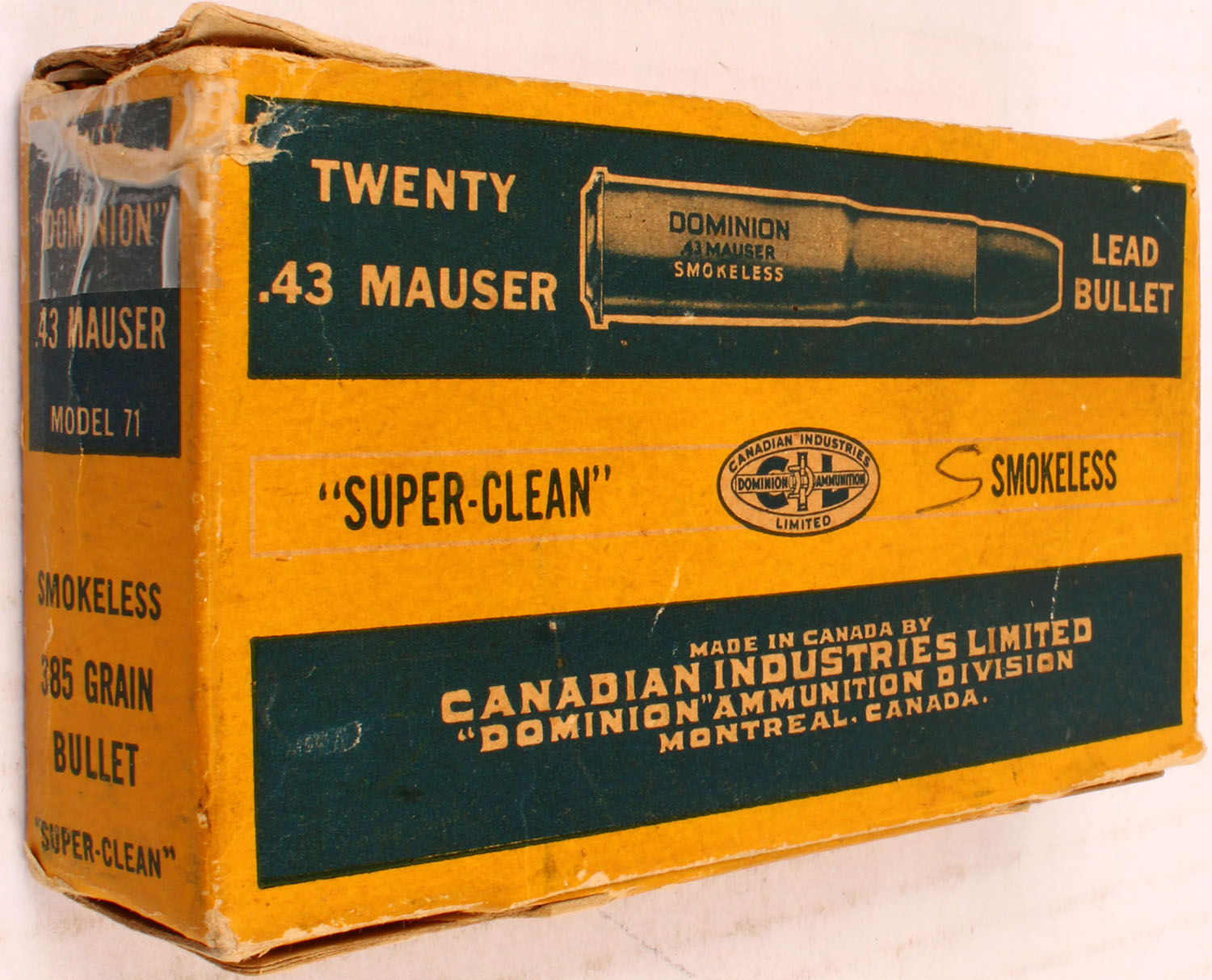 Dominion, .43 Mauser, Smokeless, Lead Bullet, 1pc, Full, yellow box with blue label & white/blue print, box is solid with one inside flap missing, tape, light rub marks, edge wear, & light age soiling ammo is very good. Grade: Very Good + - Value: 30 to 60