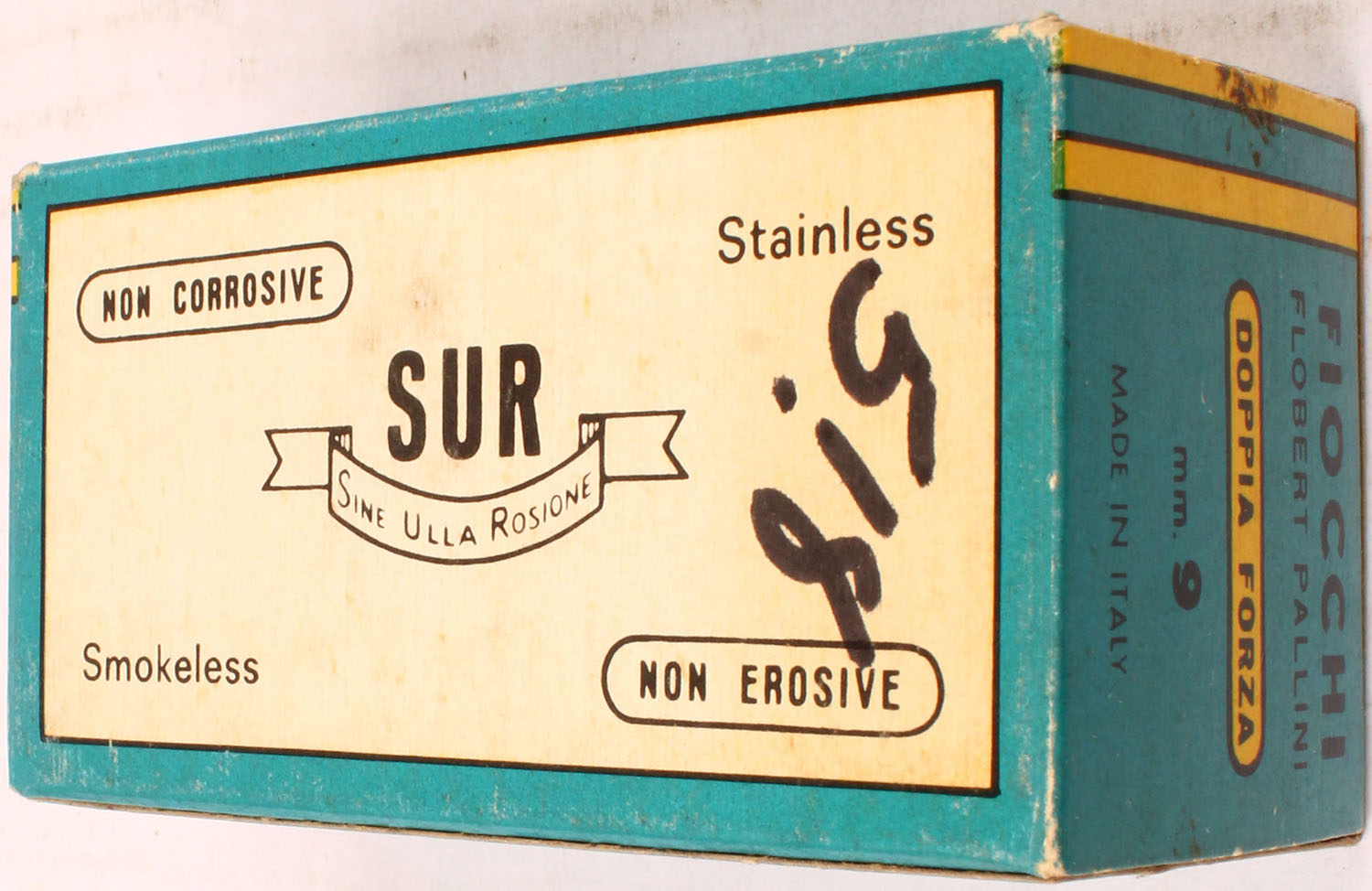 Fiocchi, 9mm R.F., smokeless, 1pc, Full, blue box with yellow/black print, box is solid with light rub marks, ammo is excellent. Grade: Excellent ++ - Value: 30 to 60