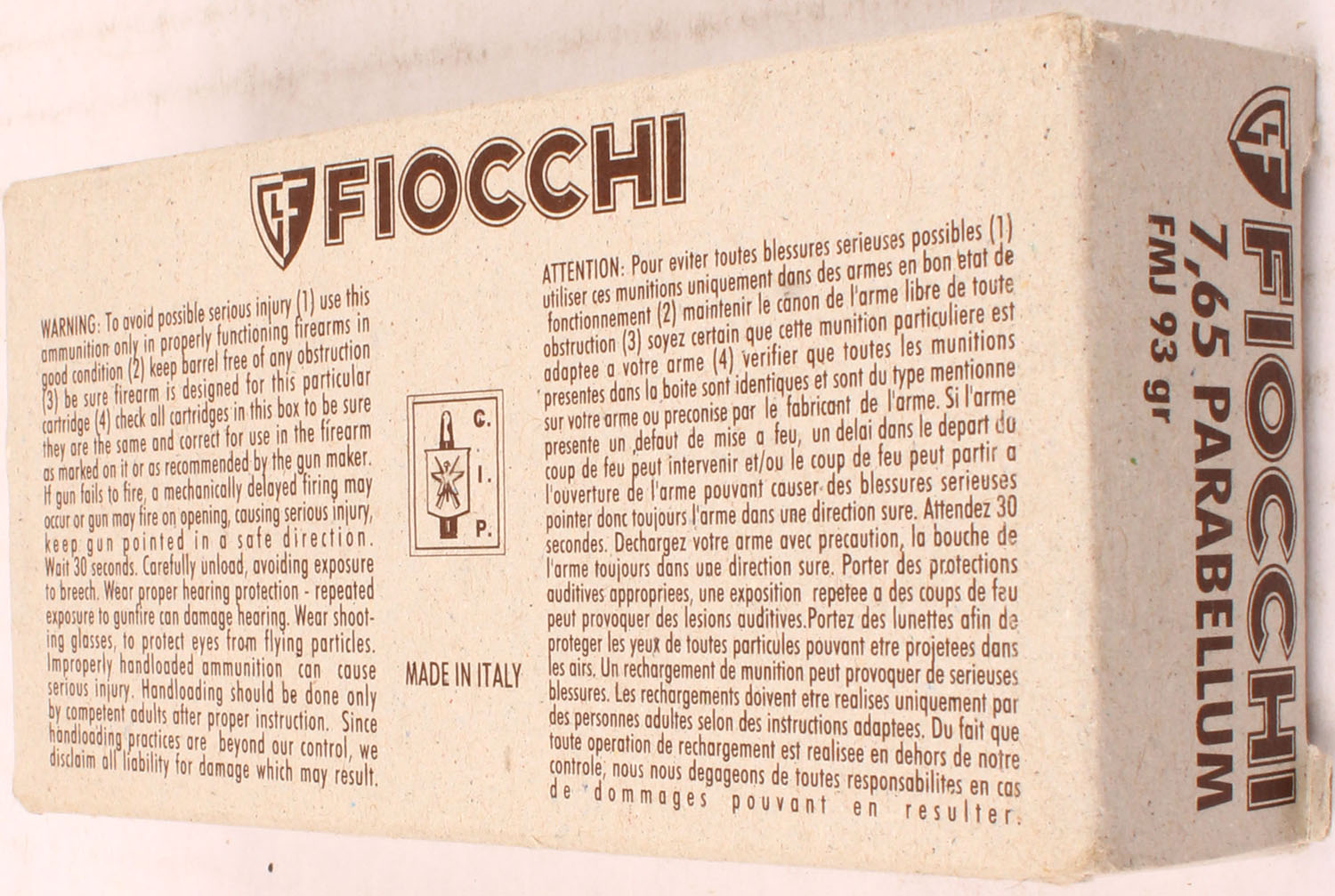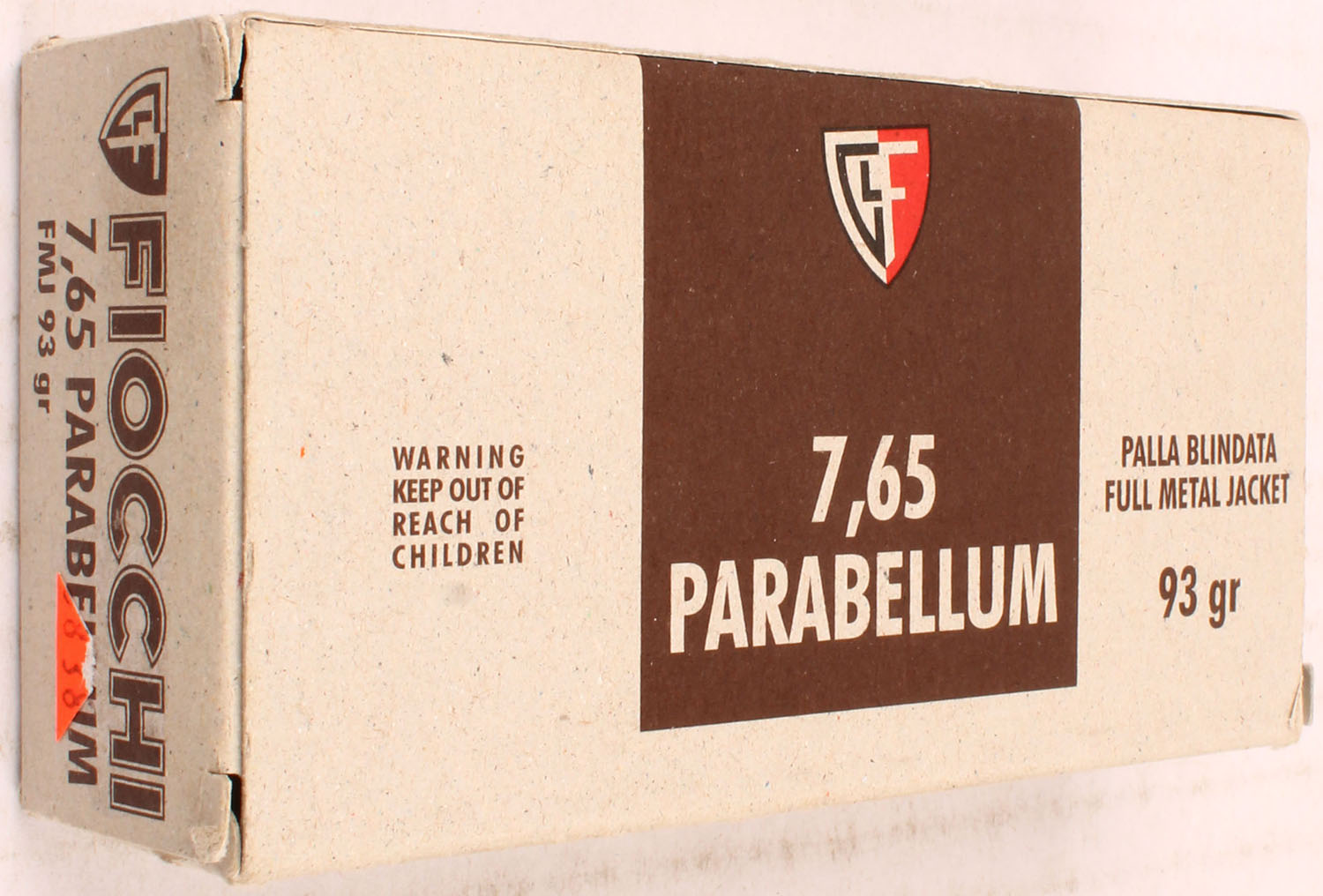 Fiocchi, 7.65 Parabellum, 93 Gr. FMJ Bullet, 1pc, Full, gray box with brown label & white/brown print, box is solid with light wear ammo is MINT. Grade: Excellent ++ - Value: 30 to 60