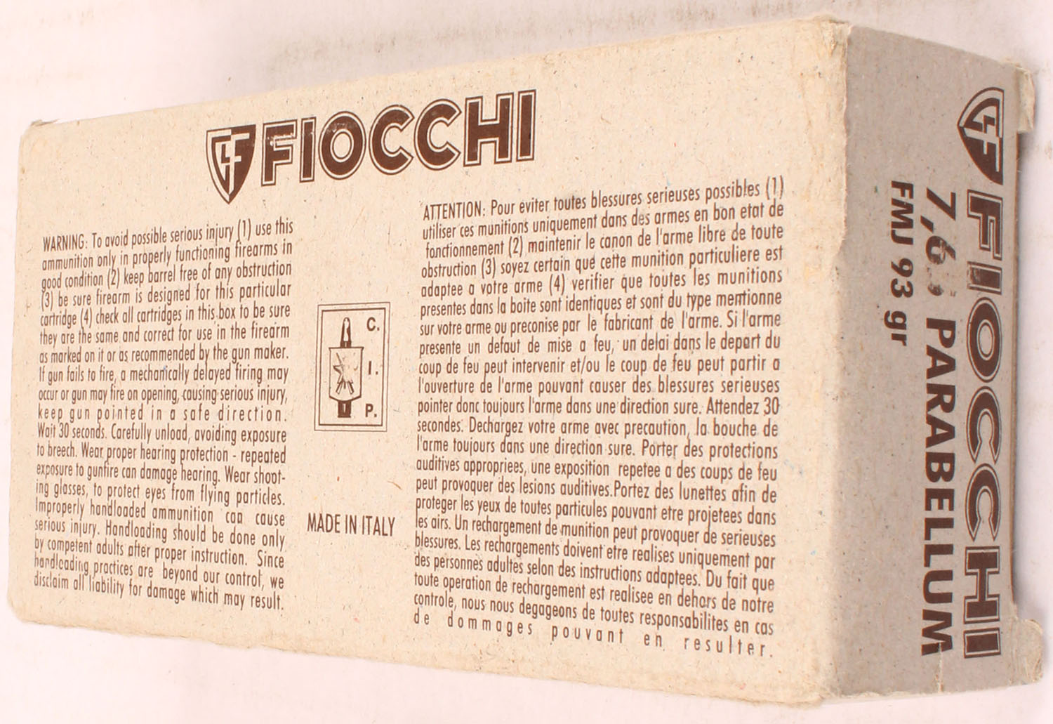 Fiocchi, 7.65 Parabellum, 93 Gr. FMJ Bullet, 1pc, Full, gray box with brown label & white/brown print, box is solid with light wear ammo is MINT. Grade: Excellent ++ - Value: 30 to 60