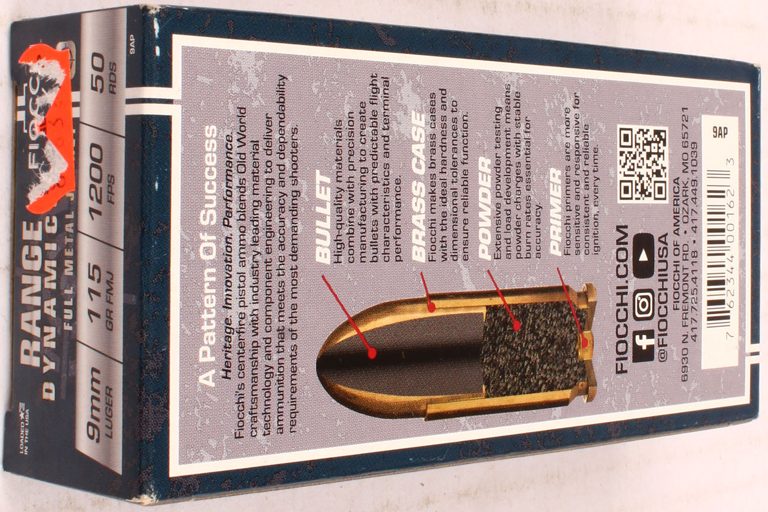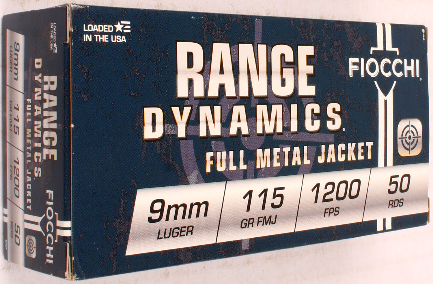 Fiocchi, Range Dynamics, 9mm Luger, 115 Gr. FMJ Bullet, 1pc, Full, blue box with gray/white label & black print, box is solid with light rub wear, ammo is MINT. Grade: Excellent ++ - Value: 30 to 60