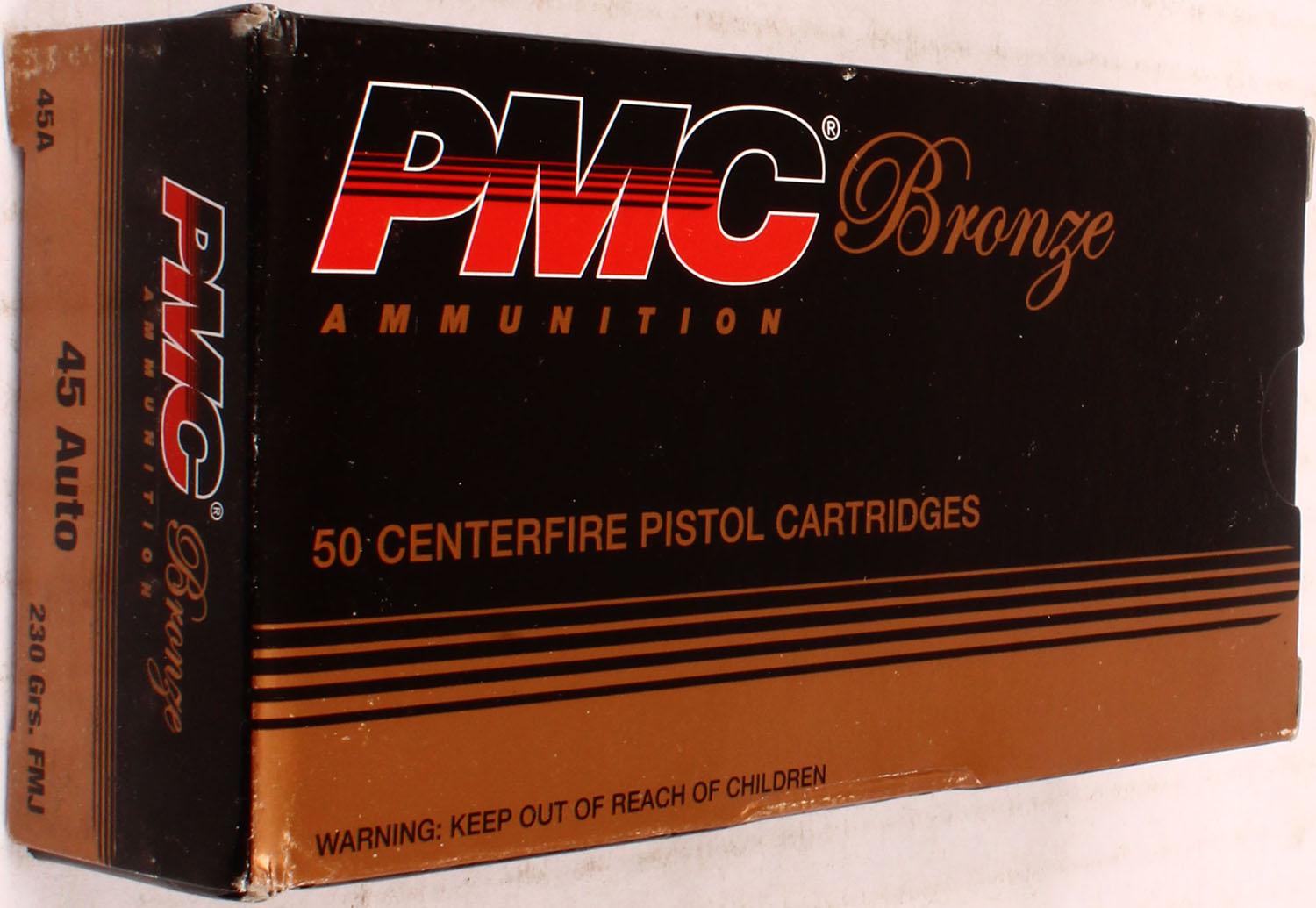 PMC, Bronze, .45 Auto, 230 Gr. FMJ bullet, 1pc, Full, black/bronze box with black/bronze/red print, box is solid with light rub wear, ammo is excellent. Grade: Excellent ++ - Value: 30 to 60