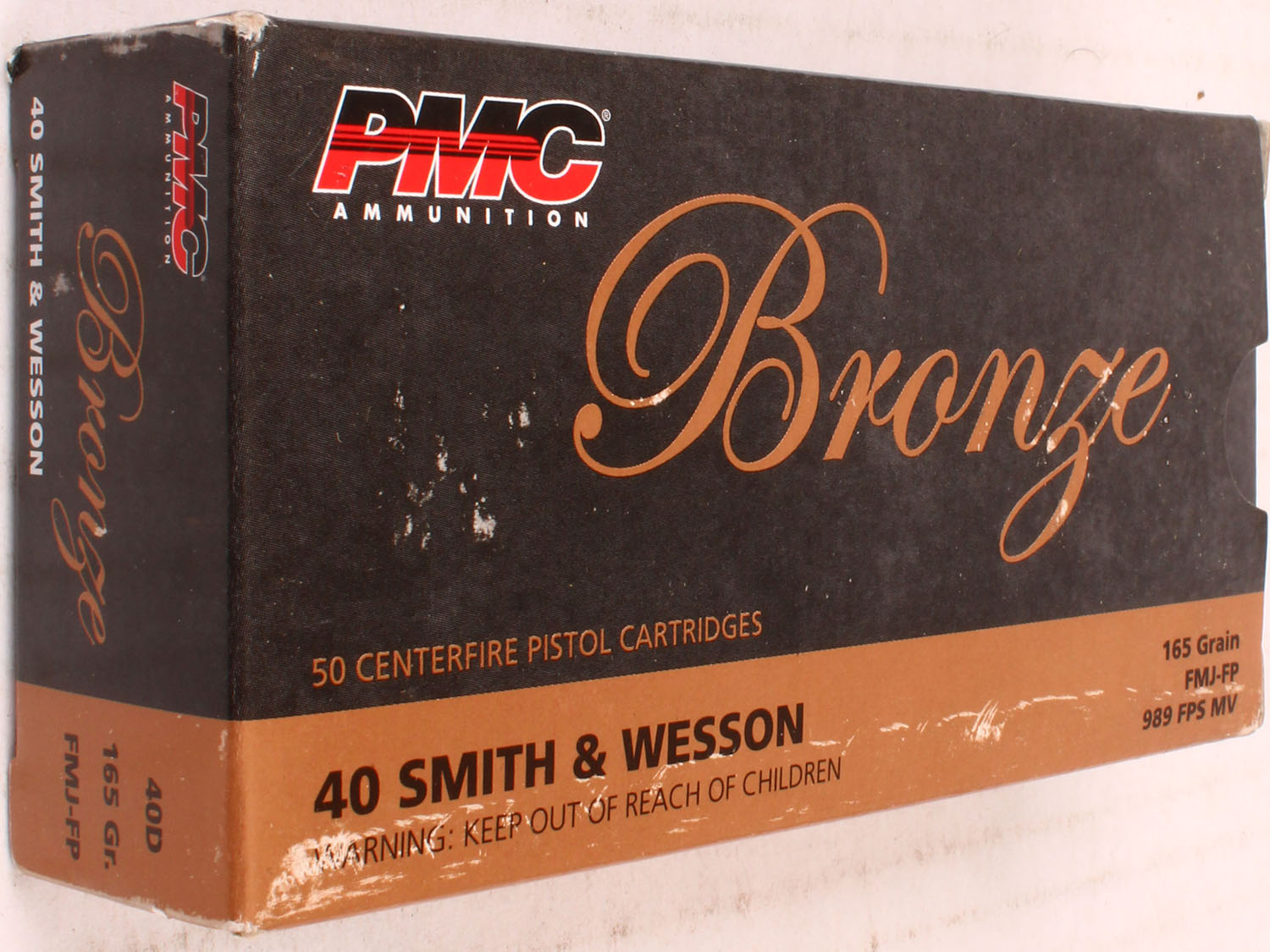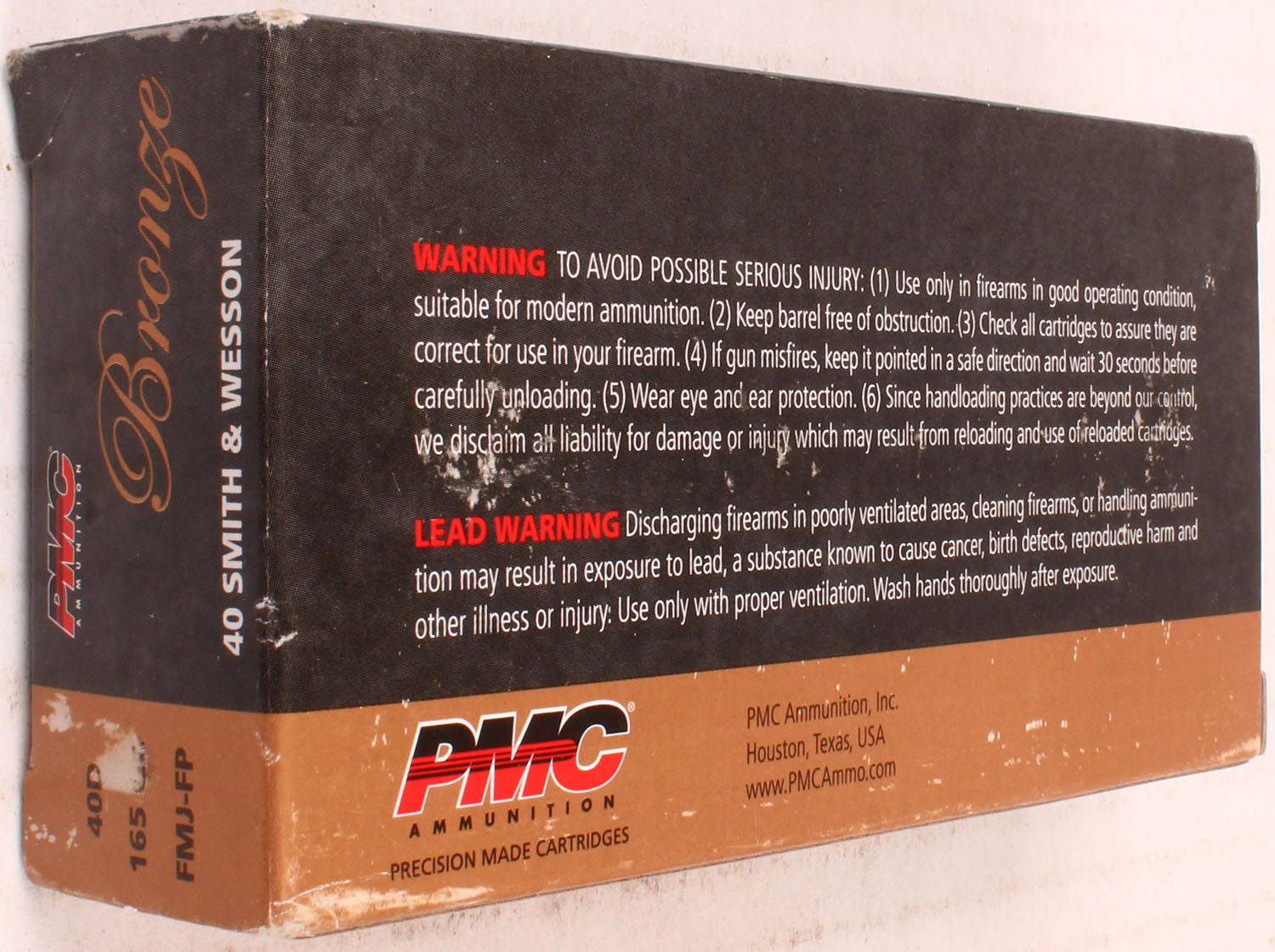 PMC, Bronze, 40 Smith & Wesson, 165 Grain FMJ-FP, Full, 1pc., multi-colored box, box is solid with excellent color, Ammo is excellent. Grade: Excellent ++ - Value: 20 to 60