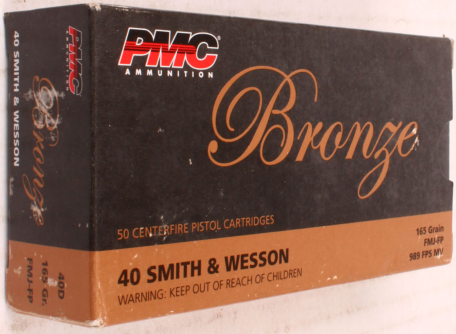 PMC, Bronze, 40 Smith & Wesson, 165 Grain FMJ-FP, Full, 1pc., multi-colored box, box is solid with excellent color, Ammo is excellent. Grade: Excellent ++ - Value: 20 to 60