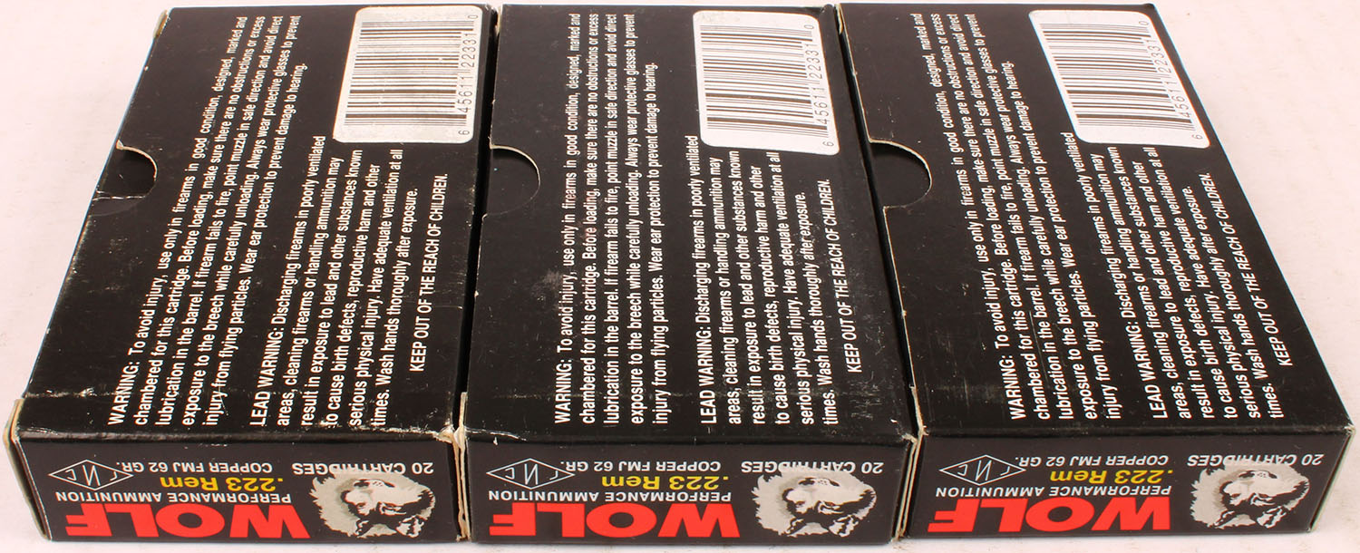 Lot of 3 Wolf, 223 Rem, 62 Grain Copper FMJ, Full, 1pc., Multi-colored box, box is solid with excellent color, Ammo is excellent. Grade: Excellent - Value: 20 to 60