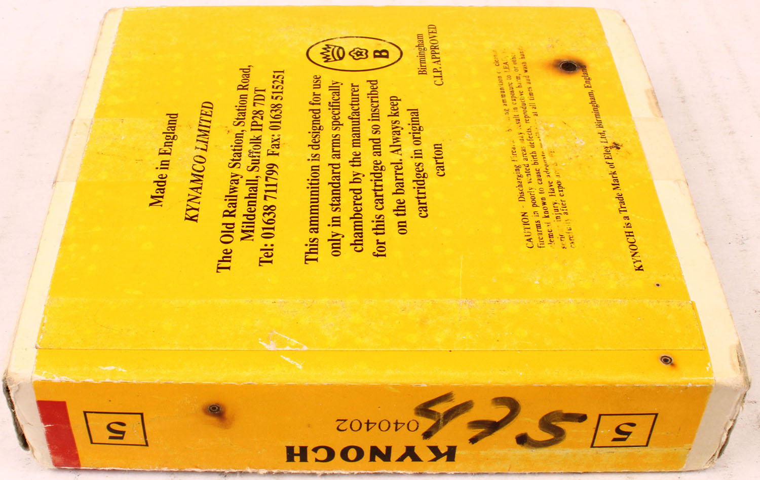 Kynoch, 475 No.2 Jeffery, 500 Grains Soft-Nosed, Full, 1pc. Multi-colored box, box is solid with very nice color, Ammo is excellent. Grade: Excellent - Value: 20 to 80