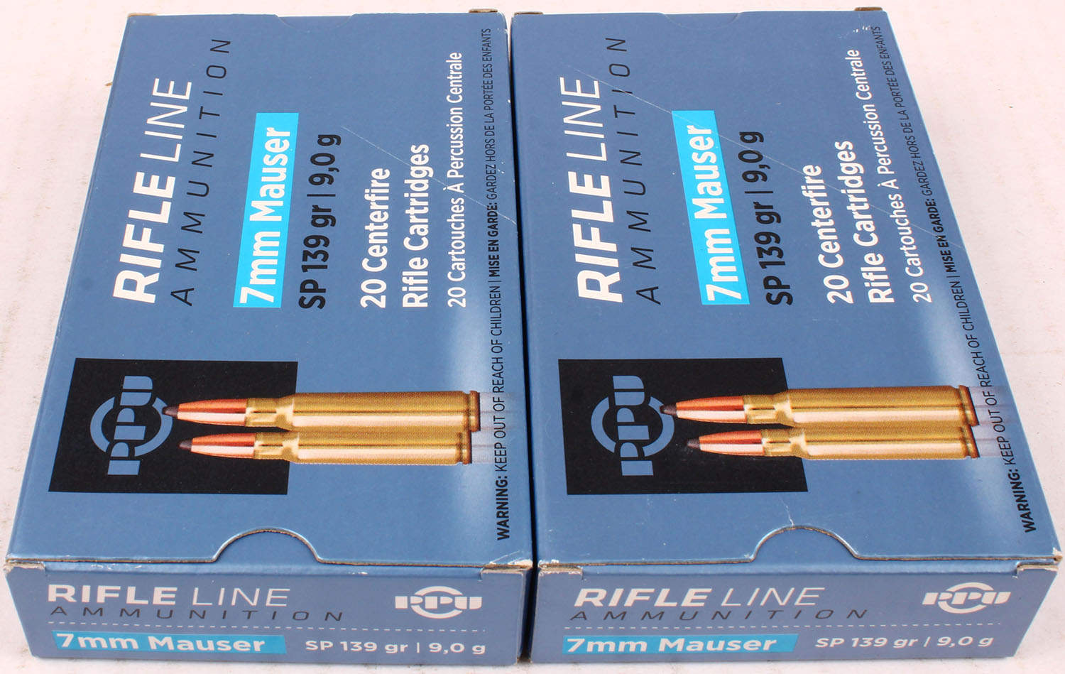 Lot of 2 PPU, 7mm Mauser, 139 Grain SP BT, Full, 1pc. Multi-colored box, box is solid with excellent color, Ammo is excellent. Grade: Excellent + - Value: 20 to 60