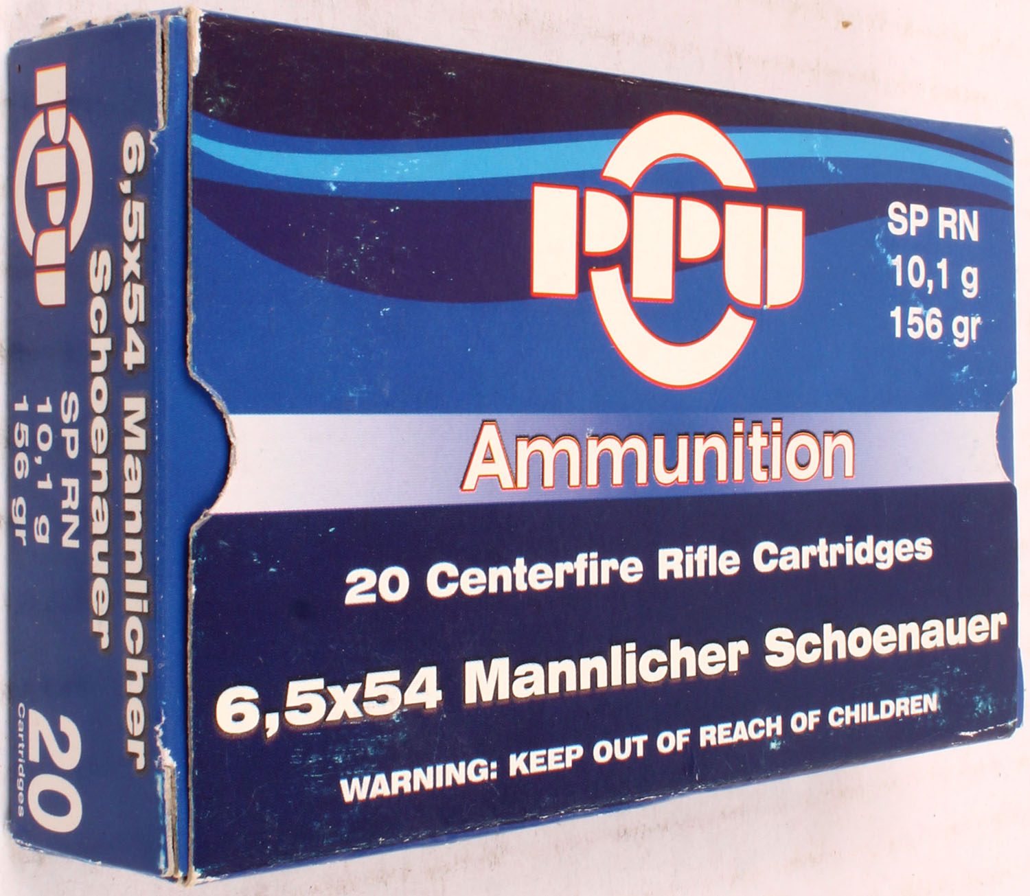 PPU, 6.5x54 Mannlicher Schoenauer, 156 Grain SP RN, Full, 1pc. Multi-colored box, box is solid with excellent color, Ammo is excellent. Grade: Excellent + - Value: 20 to 60