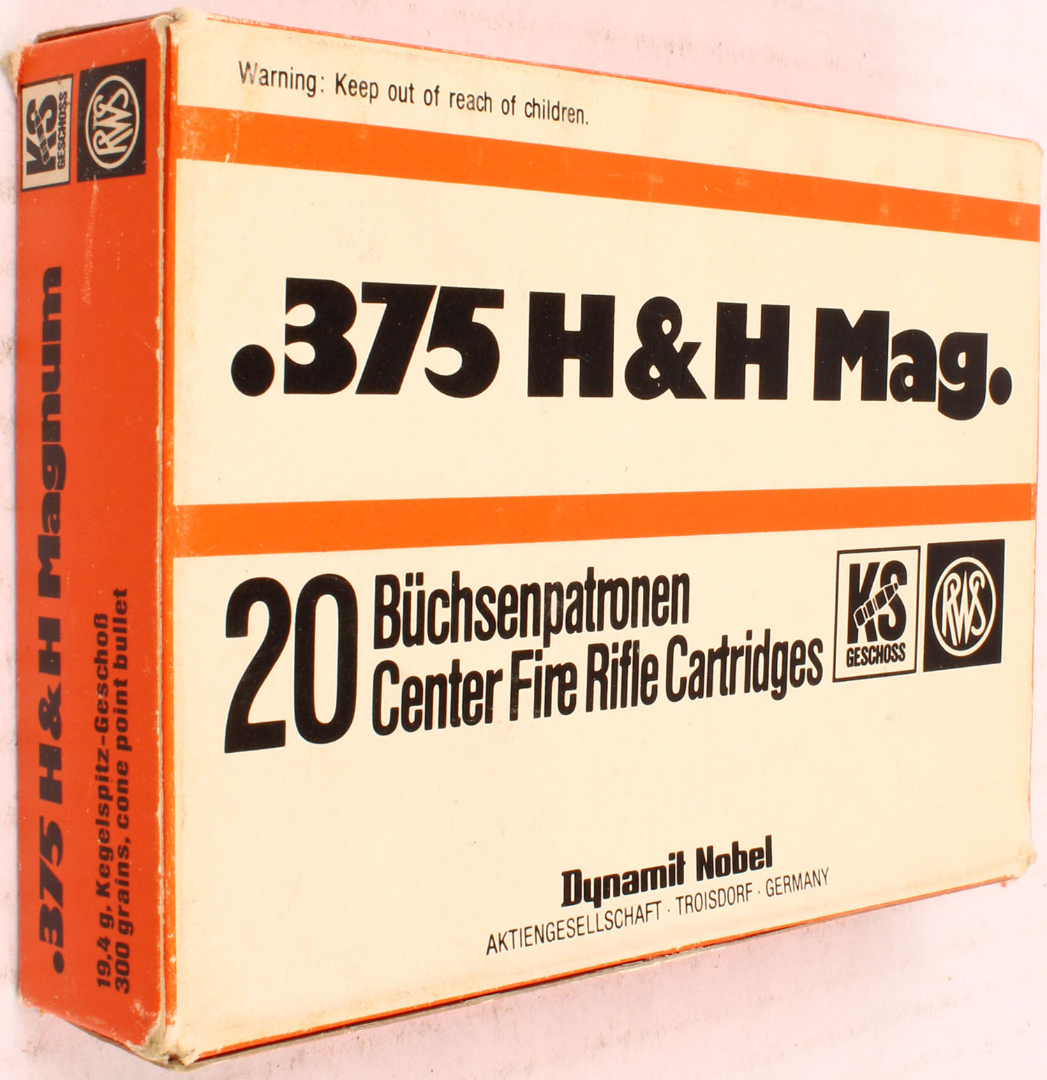 RWS, 375 H&H Mag, 300 Grain Cone Point Bullet, Full, 1pc. Multi-colored box, box is solid, with excellent color, Ammo is excellent. Grade: Excellent - Value: 20 to 80