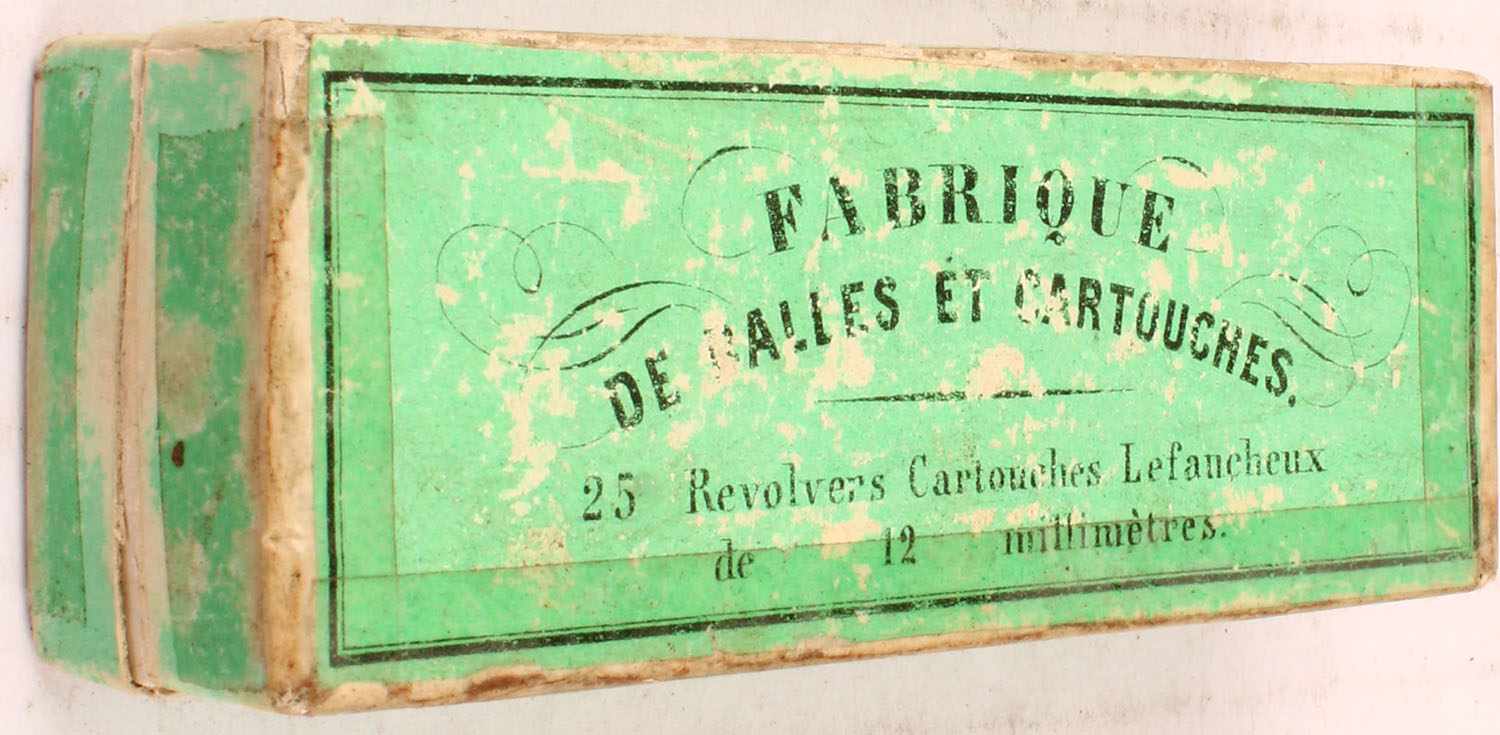 Fabrique, 12mm Pinfire, Full, 1pc. Multi-colored box, box is solid, with excellent color, Ammo is excellent. Grade: Excellent - Value: 20 to 80
