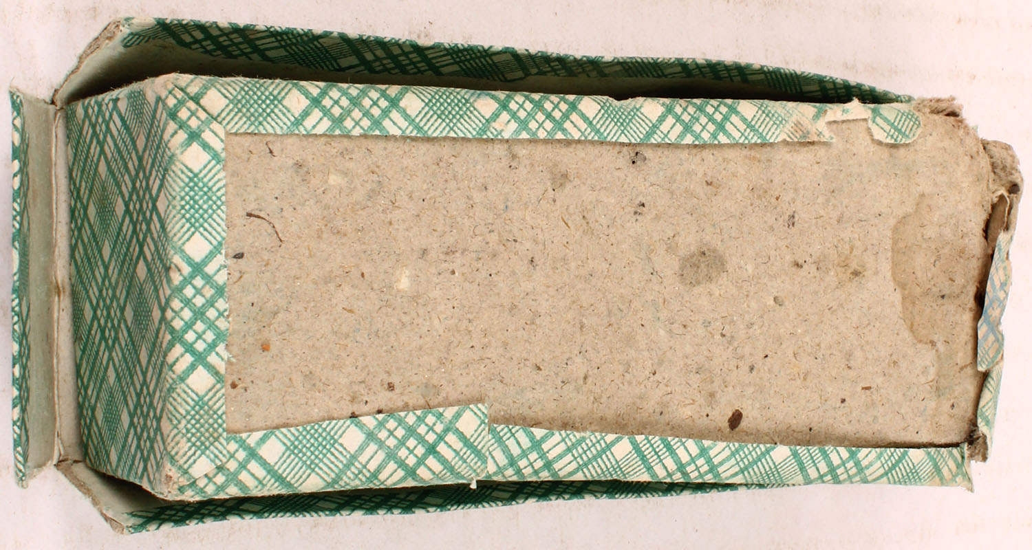 Houllier-Blanchard, 12mm Pin Fire, Full, 2pc. Green fabric box, box integrity is fully compromised with multiple seam splits, box has excellent color, ammo is very good. Grade: Good - Value: 40 to 120