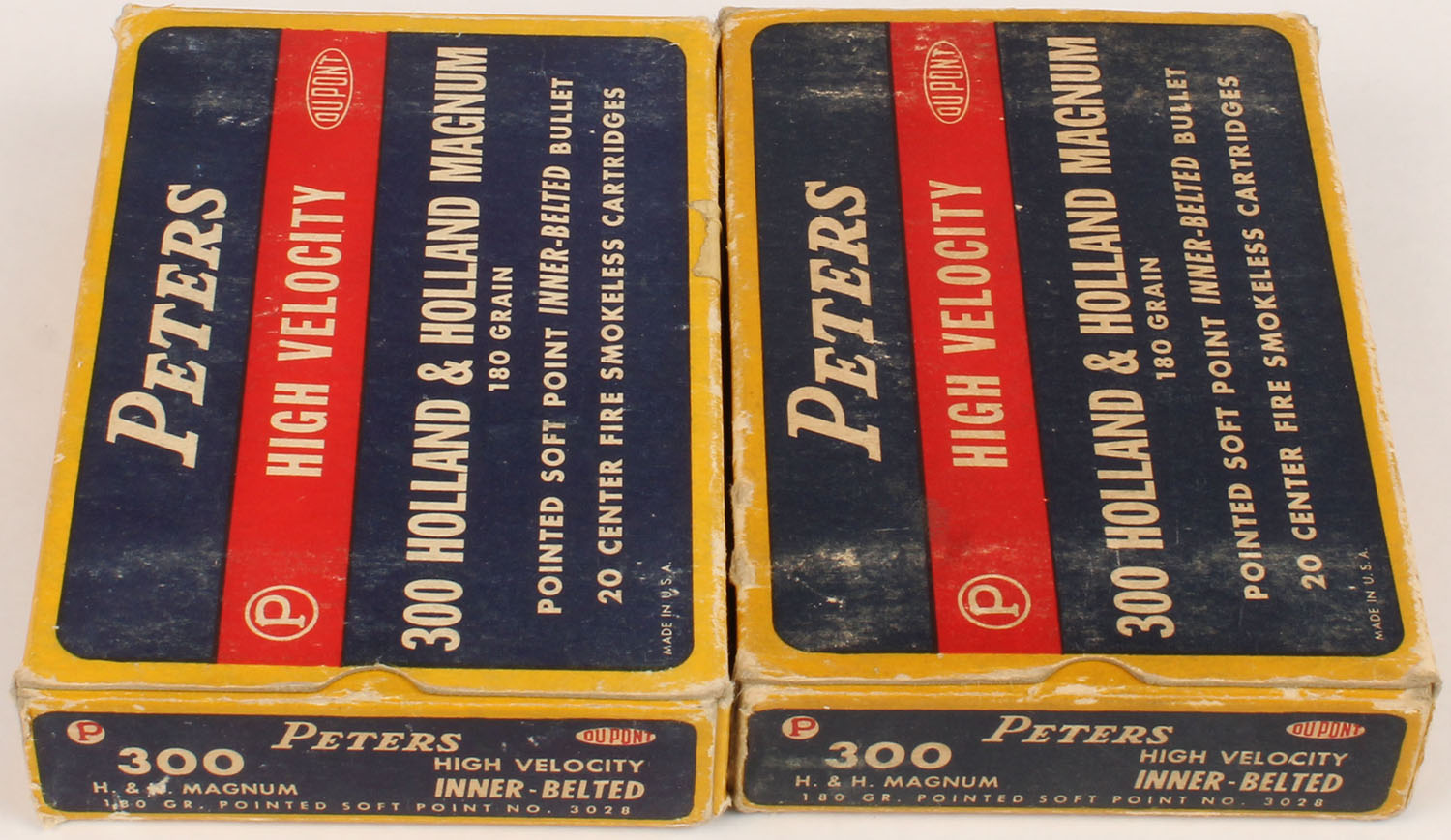 Peters, Lot of (2) .300 H&H Magnum, Both boxes Partial - (1) box 18rds. Correct, (1) box 8rds. Incorrect ammo, boxes are solid with excellent color, ammo is excellent. Grade: Very Good - Value: 10 to 50