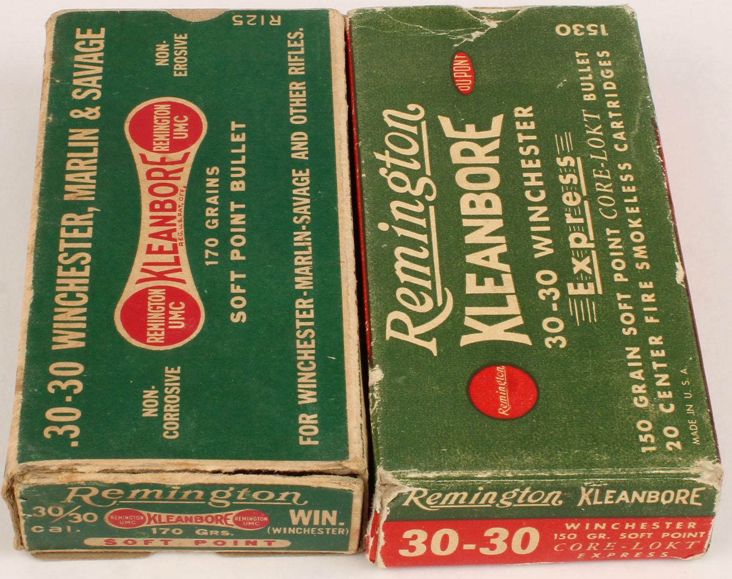 Remington, Kleanbore, Lot of (2) .30-30 boxes, both boxes are full of incorrect ammo, dogbone box has 2 torn end flaps, boxes otherwise solid with excellent color, ammo is excellent. Grade: Very Good - Value: 10 to 50