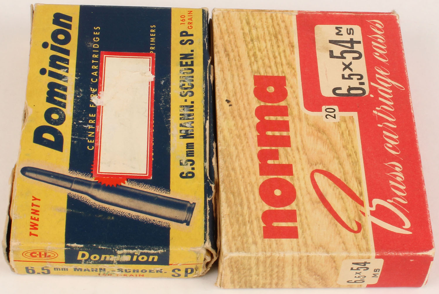 Mixed Mfg., Lot of (2) 6.5mm Mannlicher-Shoen, both boxes partial with mixed ammo, boxes are solid with very good color, ammo is excellent. Grade: Very Good - Value: 8 to 40