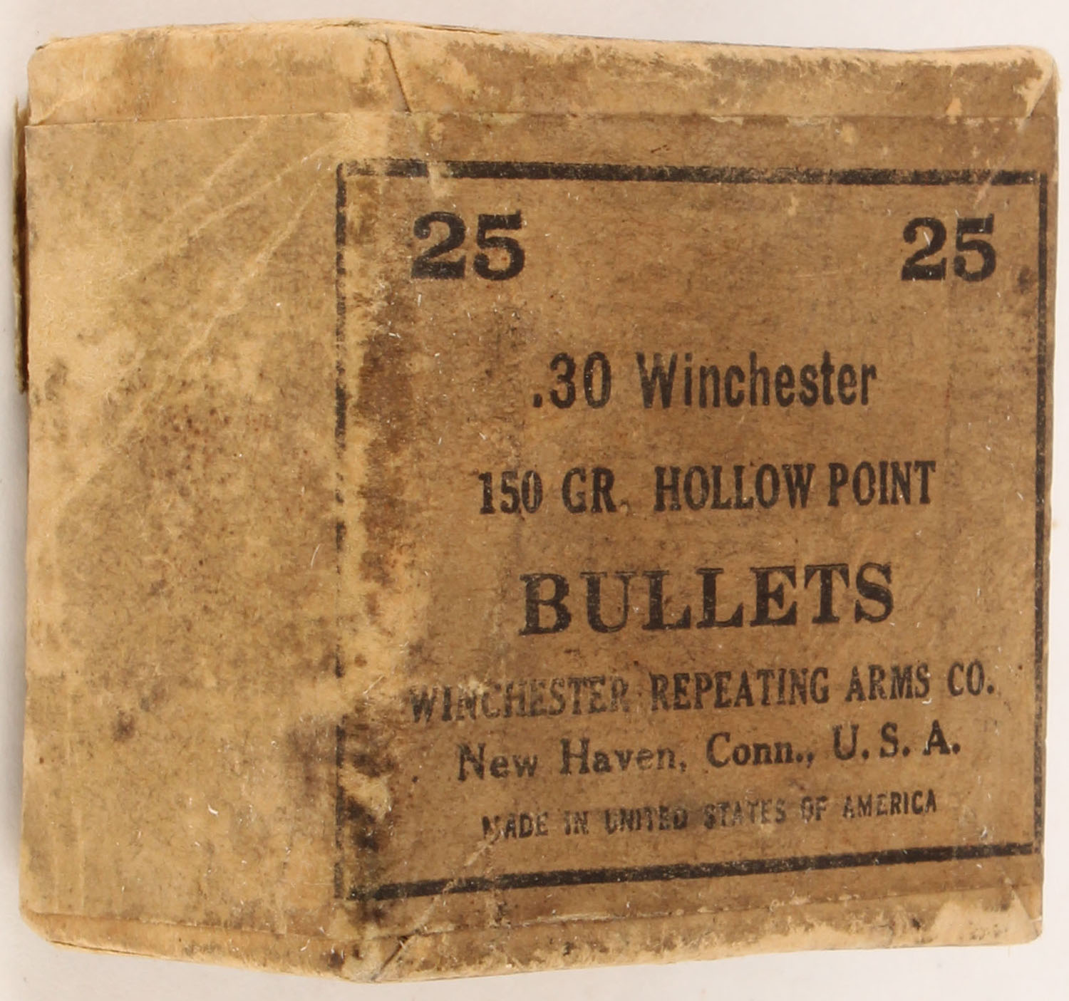 Winchester, .30 Winchester, 150 Grain Hollow Point Bullets, Partial 20rds. Of incorrect ammo, 2pc. Buff box with buff label, box is solid with very good color, age soiling, some edge & corner wear, label is intact, ammo is excellent. Grade: Very Good ++ - Value: 2 to 20