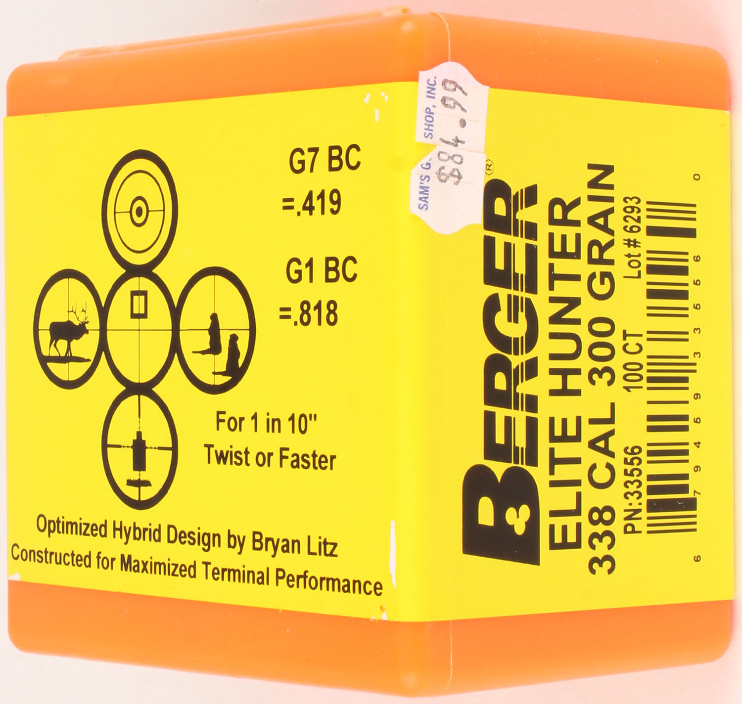 Berger, Elite Hunter, 338 Cal., 300 GR., FULL & SEALED, 1pc., orange plastic box with yellow & black label, box is solid with excellent color. Grade: Excellent ++ - Value: 10 to 40