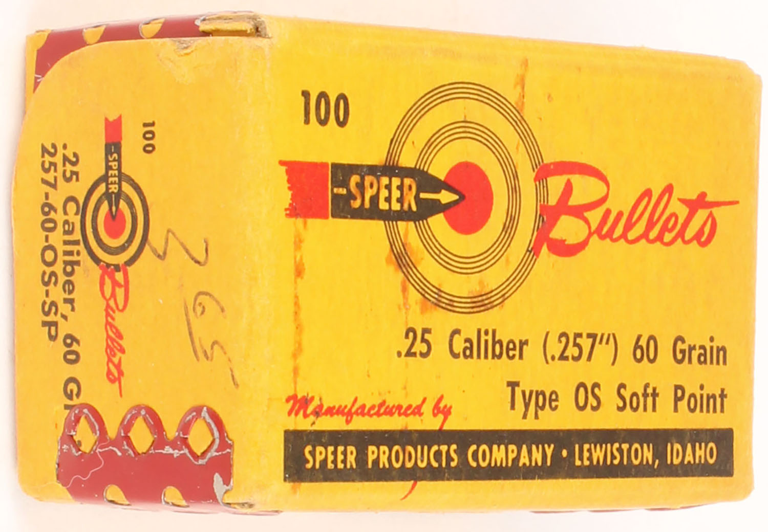 Speer, .25 Cal., 60 Grain Type OS Soft Point, FULL & SEALED, 1pc. Multi-colored box, box is solid with very good color. Grade: Excellent - Value: 10 to 40