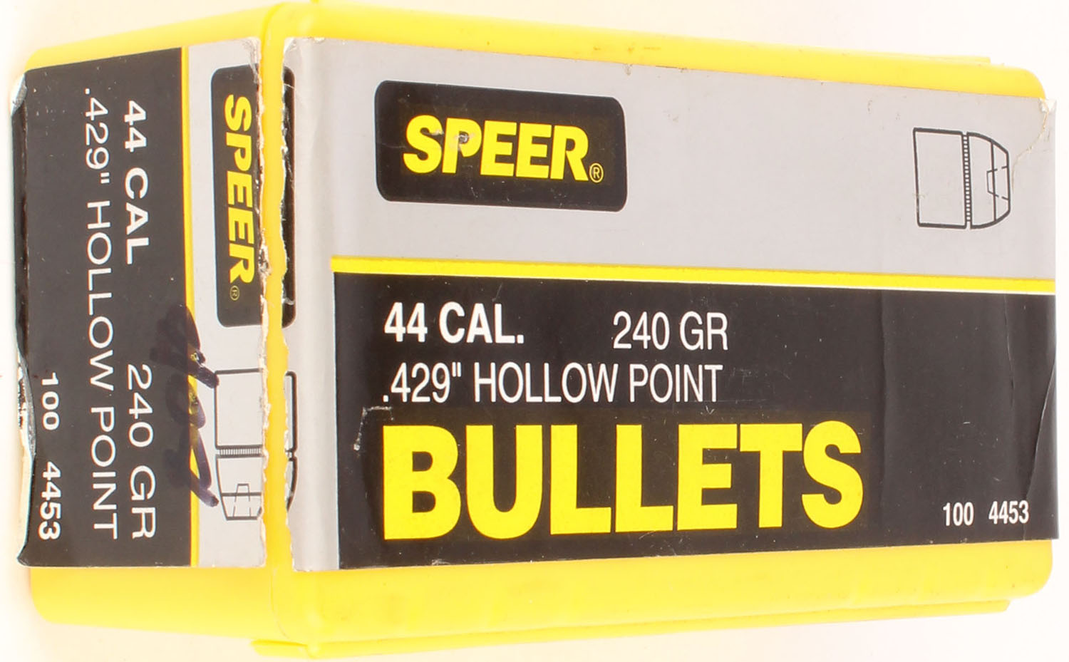 Speer, 44 Cal., 240 Grs. HP, Full, 1pc., multi-colored box, box is solid with very nice colors, Bullets are excellent. Grade: Excellent + - Value: 10 to 40