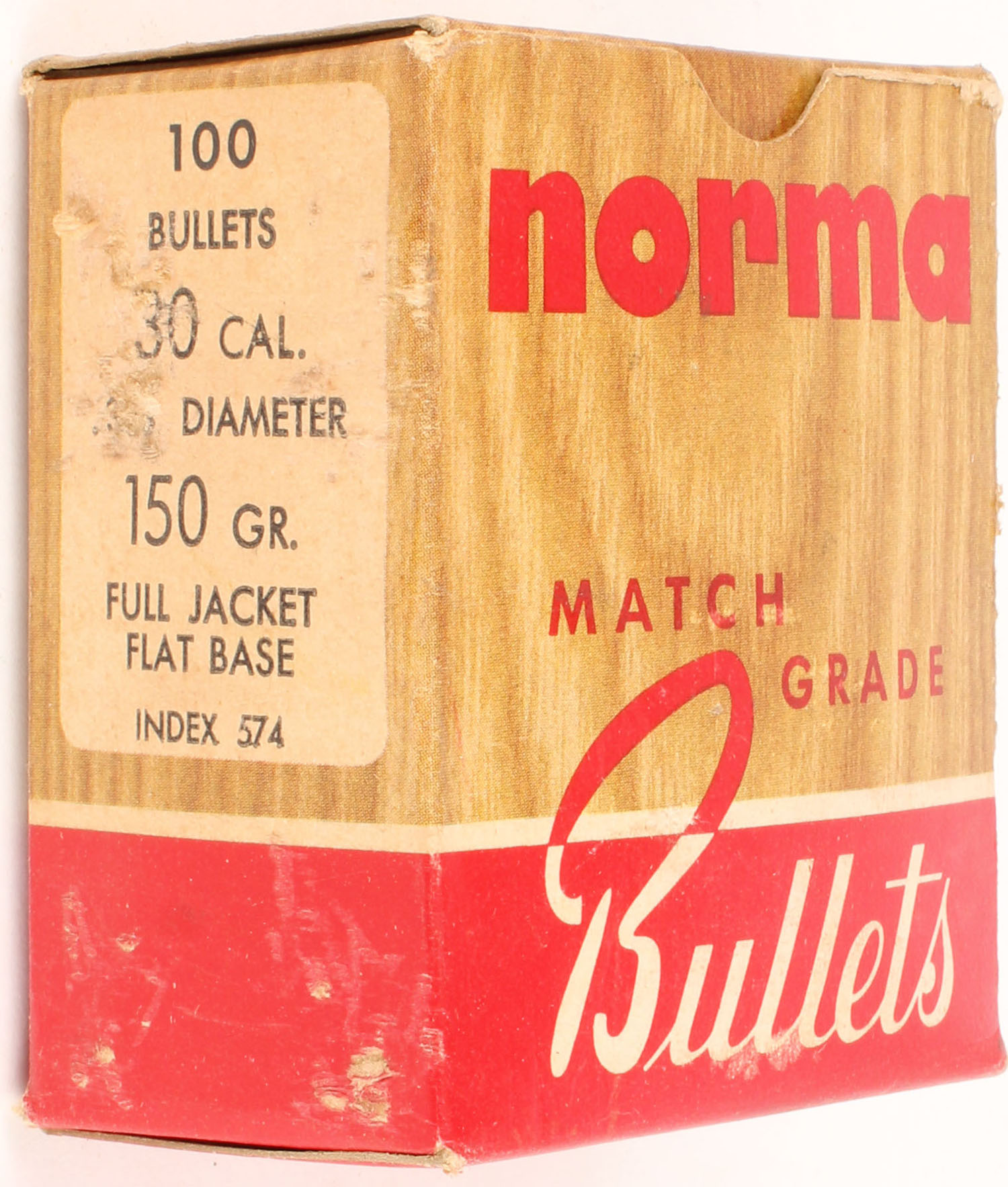 Norma with Insert, 30 Cal., 150 Grs. Full Jacket Flat Base, Full, 1pc., multi-colored box, box is solid with great colors, bullets are excellent. Grade: Excellent - Value: 10 to 40