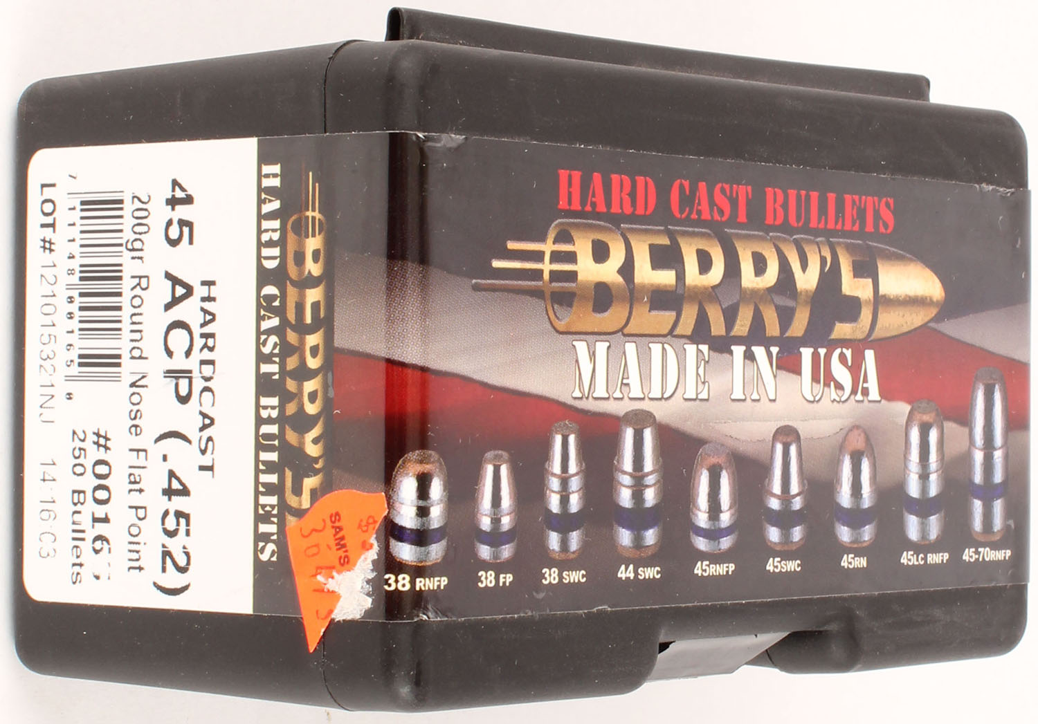 Berry's, Premium Plated Bullets, .45 ACP, 200 Gr. Round Nose Flat Point, FULL & SEALED, 1pc. Black plastic box, box is MINT with minty color. Grade: MINT - Value: 10 to 40