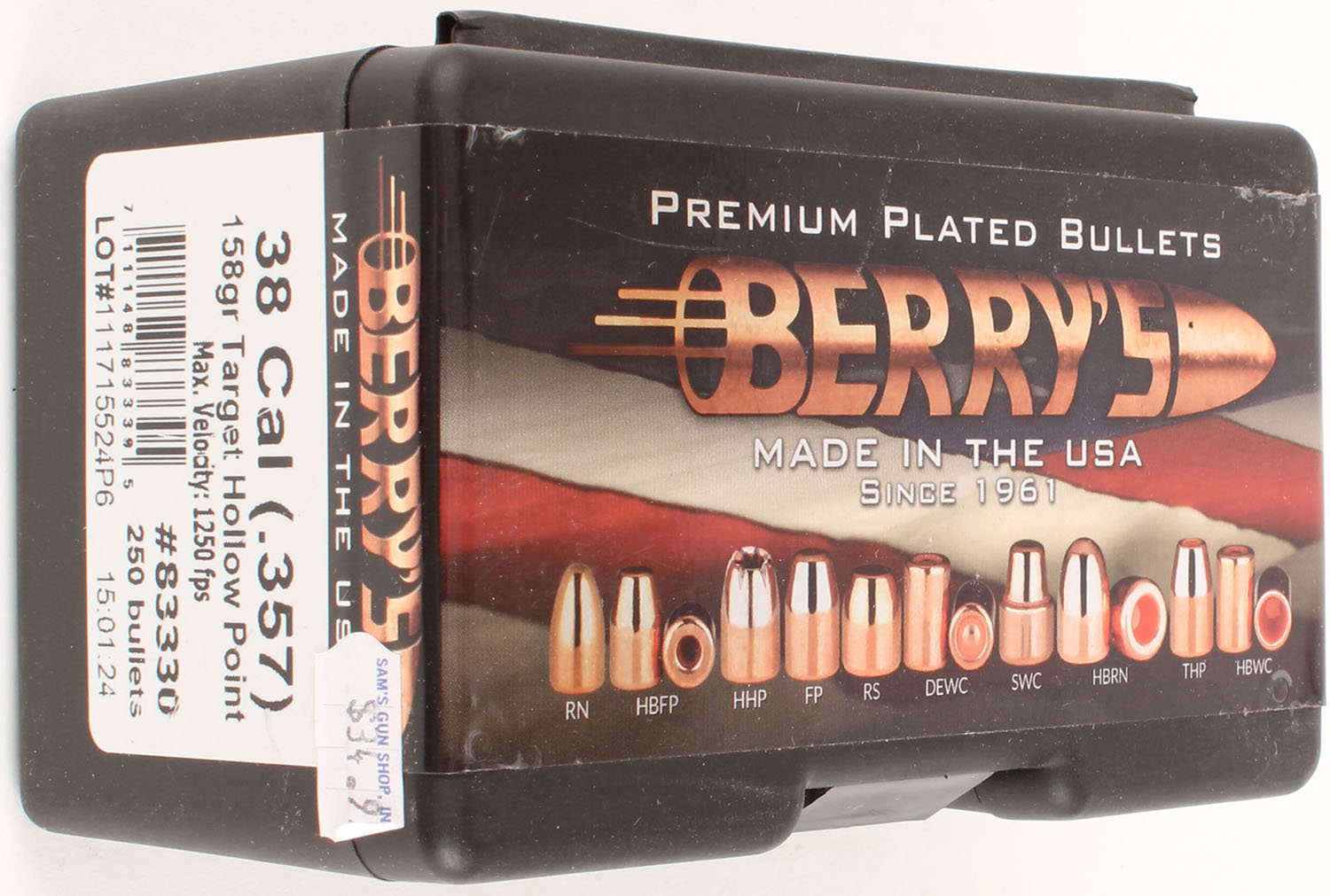 Berry's, Premium Plated Bullets, .38 Cal., 158 Gr. Target HP, FULL & SEALED, 1pc. Black plastic box, box is MINT with minty color. Grade: MINT - Value: 10 to 40
