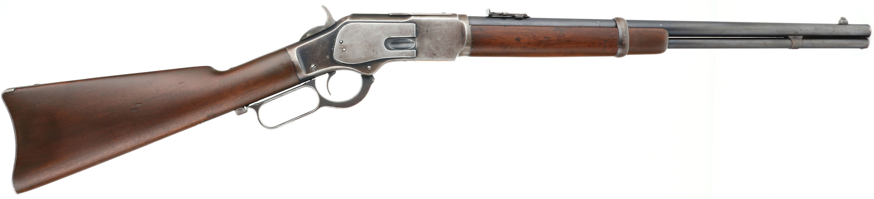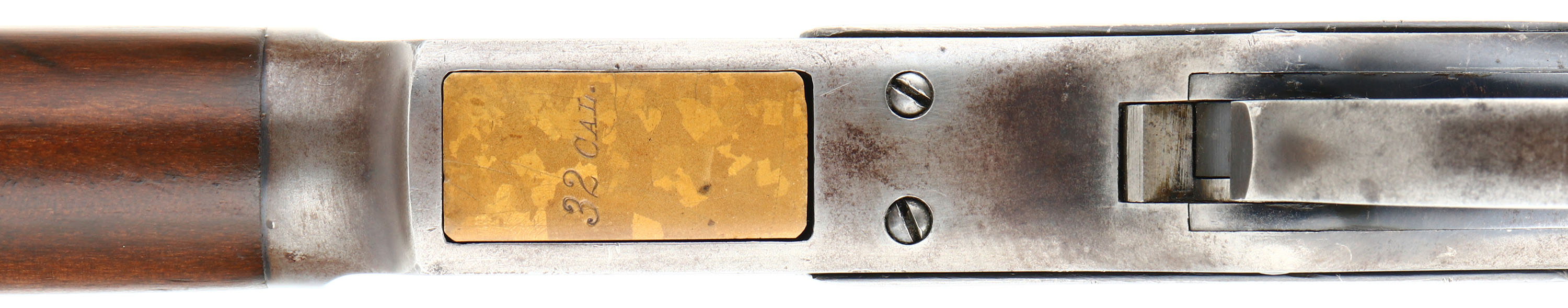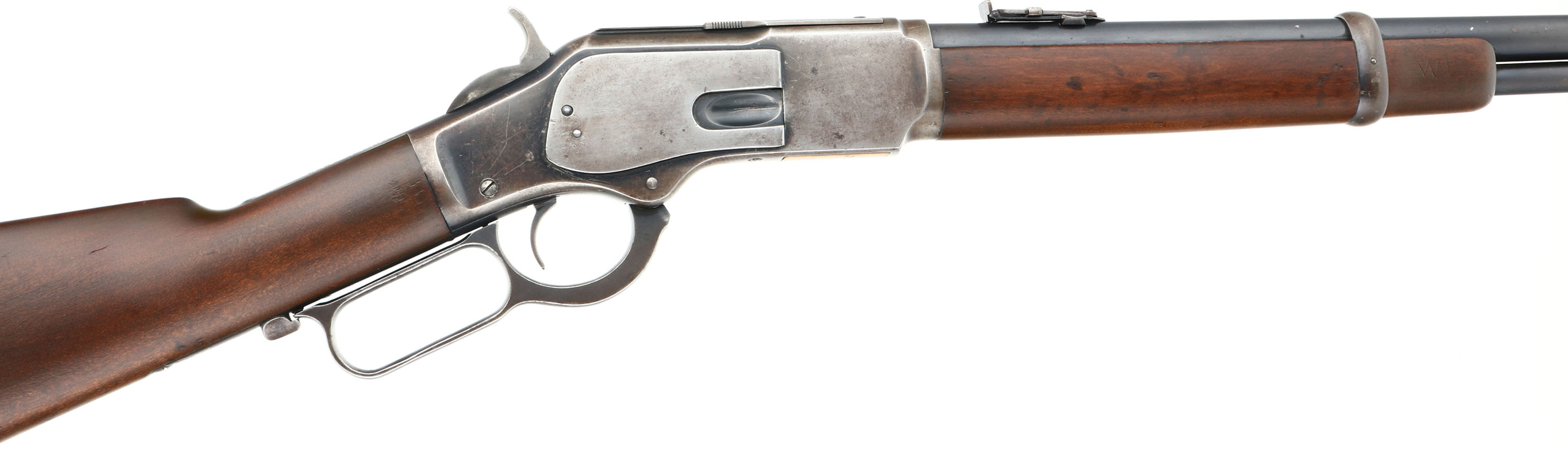 FANTASTIC Winchester, Model 1873 Saddle Ring Carbine, 3rd model, .32 WCF Cal., MFG: 1917, SN: 718416, Lever Action Carbine, 20'' Round barrel, Full mag. The original wood stocks are excellent & solid, having been cleaned, possibly lightly sanded & re-oiled. The wood has a nice aged or darkened rich chocolate brown appearance. There are a few minor handling marks & contusions. The original metal blue finish on the barrel & mag rates 85% overall. The receiver has worn mostly gun metal gray, with original blue remaining on the back half the receiver due to the protection of the side panels. Fitted with a flip-up ladder rear & box carbine front sights. Bore is very good, with some speckled roughness amongst strong rifling. Metal carbine butt. Original saddle ring. Very smooth tight action. With just over 720,000 Model 1873 guns produced, this is a very late production carbine. Comes with a Cody Factory Records Letter confirming configuration & dates. An excellent & desirable Model 1873 SRC in the rarer 32 WCF.* FFL or C&R Req. - Value: 9000 to 13000