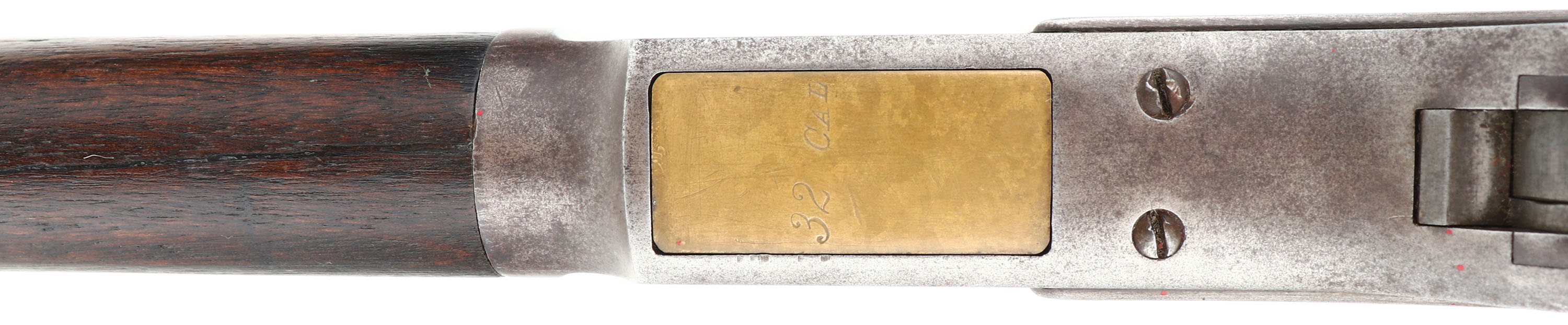 Winchester, Model 1873 Saddle Ring Carbine, 3rd model, .32 WCF Cal., MFG: 1897, SN: 509559B, Lever Action Carbine, 20'' Round barrel, Full mag. The original wood stocks are very good & solid, having been lightly sanded & refinished. The wood has a nice aged or darkened rich chocolate brown appearance. There are a few minor handling marks or rubs to the stock. The forend has a tight 4'' crack & a couple of tight 1'' grain cracks at the tip, along with minor contusions & scrapes. The original metal blue finish on the barrel & mag rates 85%. The receiver has worn gun metal gray, with a thin layer of brown patina present. Fitted with a flip-up ladder rear & box carbine front sights. Bore is excellent. Metal carbine butt. Original saddle ring, with leather lashing. Tight smooth action. Comes with a Cody Factory Records Letter confirming configuration & dates. A very nice & desirable Model 1873 SRC in the rarer 32 WCF.* Antique, No FFL Req. - Value: 5000 to 8000