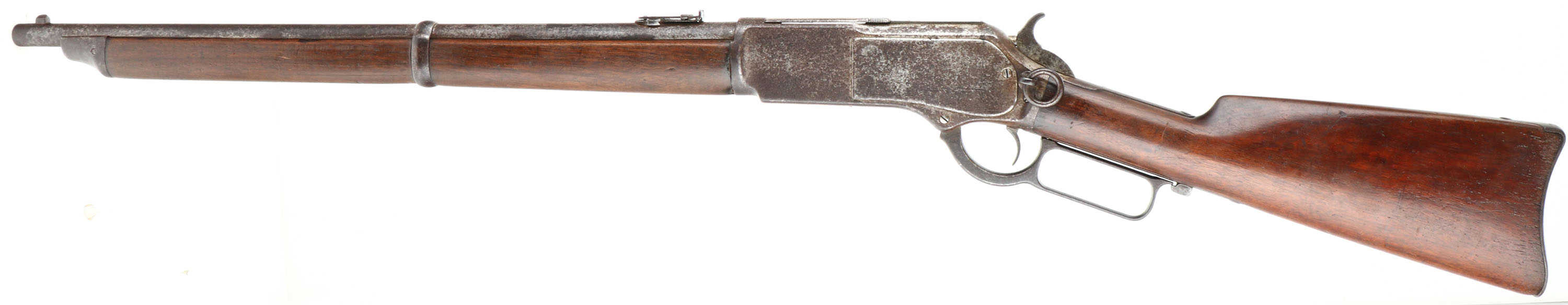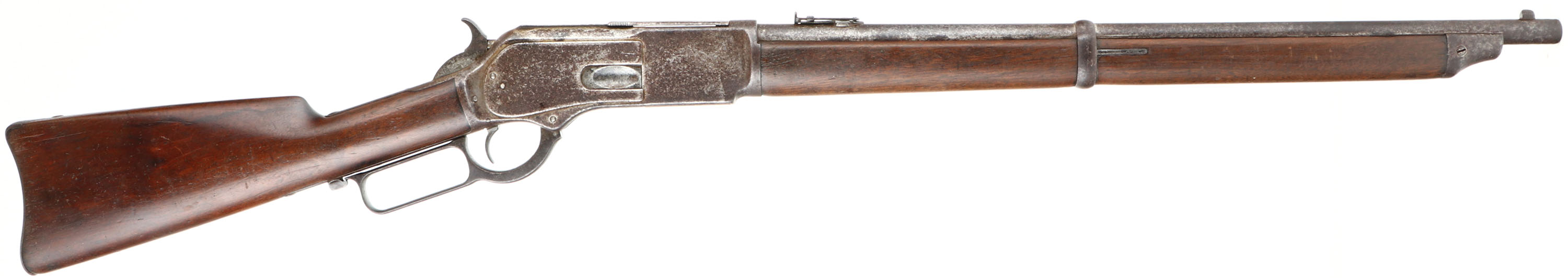 RARE Winchester, Model 1876 ''Centennial Rifle'', Saddle Ring Carbine, 3rd Variation, CAL: 45-75, MFG: 1884, SN: 43428, Lever Action Carbine, 22'' Round barrel, Full mag. The Model 1876 was originally referred to as the Centennial Rifle due to its introduction in the same year as America's Centennial anniversary. Nearly the entire production of the big Model 1876 Winchester was devoted to rifle manufacture. There was a considerable contract for carbines from the Canadian Northwest Mounted Police, but aside from these historic arms, Winchester made carbines for the civilian market on a very limited basis. Total production of all Model 1876's from 1876 to its discontinuance in 1888 (with about 300 additional arms made intermittently to 1898) was a mere 63,871. In comparison, Winchester produced 323,926 of the smaller Model 1873's from 1873-1889. By the end of production of the Model 1873, 720,609 had been produced, More than 10 fold that of the 1876. For this obvious reason, all Model 1876 Winchesters are scarce. The 1876 Saddle Ring Carbines are seldom encountered today as so few were made. Northwest Mounted Police carbines (Mountie Carbines) were a special variant used by the Canadian Northwest Mounted Police. They had a 22'' (56 centimeters) round barrel, were chambered in .45-75 Winchester, with a full length forend & a military style folding ladder rear sight calibrated in meters. This carbine is configured the same, but carries the standard ''1876'' marked folding ladder rear sight, with slide marking from 2 to 10. This carbine was built for the civilian market & is much rarer. The original straight grip wood stocks are excellent, displaying the original finish. They display several minor contusions, scrapes & scratches, with a few little edge nicks to the back edge of the forend. The metal blue finish has entirely tone to a mix of speckled brown patina, gray darkened finish & areas worn to gun metal gray. Bore is very good, displaying light spotting & pitting amongst strong rifling. In addition to the flip-up rear ladder sight, the barrel carries a box small blade carbine front sight. Buttstock carries a carbine metal buttplate. Orginal saddle ring. A rare & all original 1876 SRC collectible.* Antique, No FFL Req. - Value: 7000 to 12000