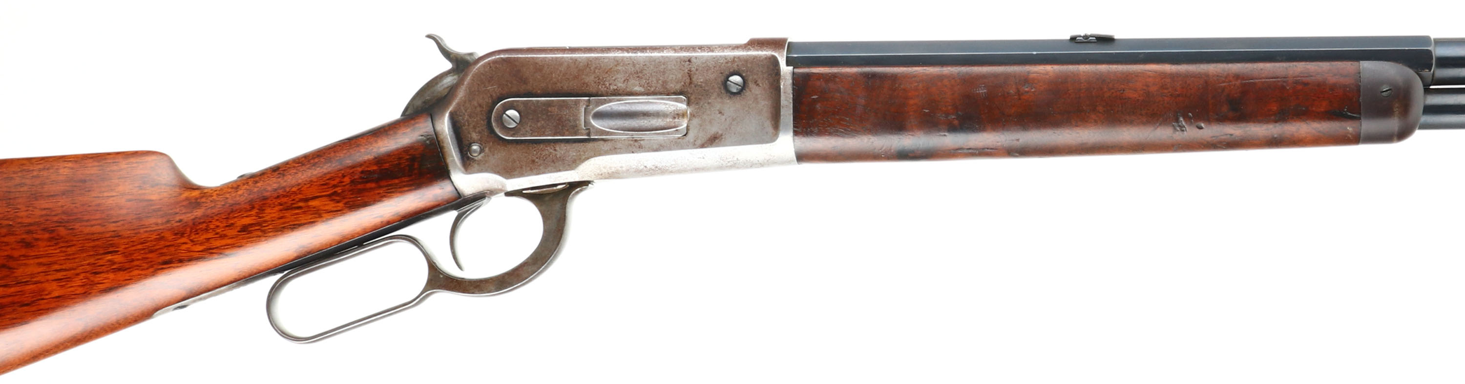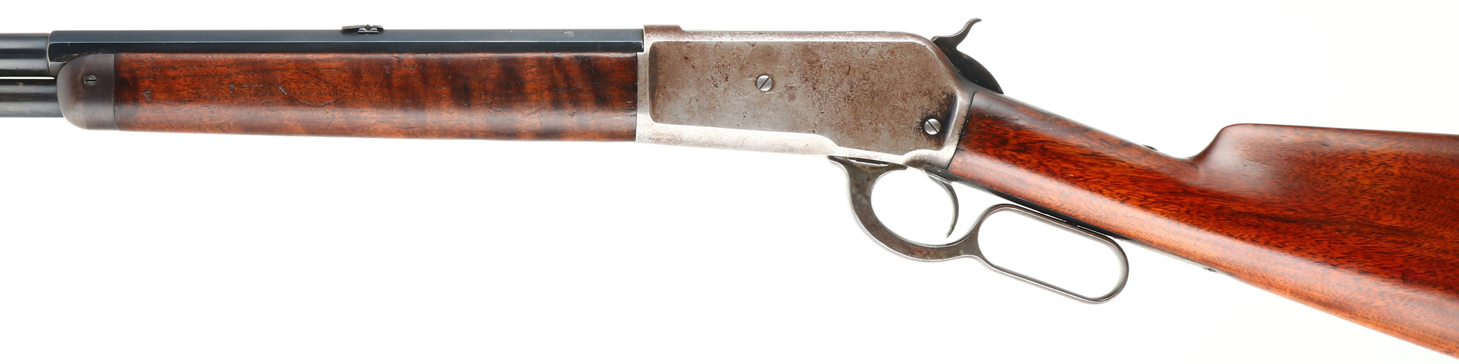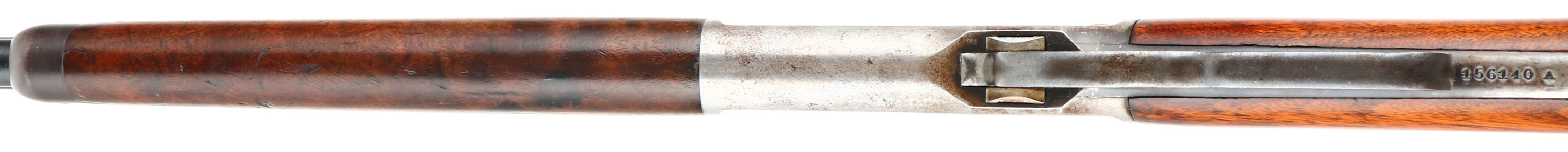 SPECIAL ORDER Winchester, Model 1886, (MATTED BARREL), CAL: 40-82 WCF, MFG: 1918, SN: 156140, Lever Action Rifle, 26'' Half octagon/half round barrel, Full mag. A special order rifle, with unique features. The orginal straight grip stocks are excellent. The stock has been lightly sanded & nicely refinished, with a couple of minor spot with filler, a very small toe chip that has also been filled & a tight repair at the top left corner of the wrist. The repairs & finish are all well done & give an overall excellent appearance. The original forend carries the original finish, with several minor contusions or scratches. The barrel is a special order having a rare full length matted top on the 1/2 octagon 1/2 round barrel. According to a 2007 WACA article on the subject, Winchester records indicate only 206 matted barrel 1886 rifles were produced in all calibers. The high luster metal blue finish on the barrel & mag has been nicely restored & rates 98%, with some light speckling under blue. The receiver, lever, hammer & forend cap are worn or faded mostly gun metal gray, with a thin layer of brown patina. The sliding bolt retains a 85% of its original bright blue. Fitted with a special order two leaf folding rear sight & a small blade front sight. Bore is excellent. Ordered with a Winchester hard rubber, widow's peak, shotgun buttplate. Comes with a Cody Winchester Factory Records Letter, which simply confirms no records for this rifle are available as the record is blank. This rare special order rifle, with a very nice overall appearance.* FFL or C&R Req. - Value: 6000 to 12000