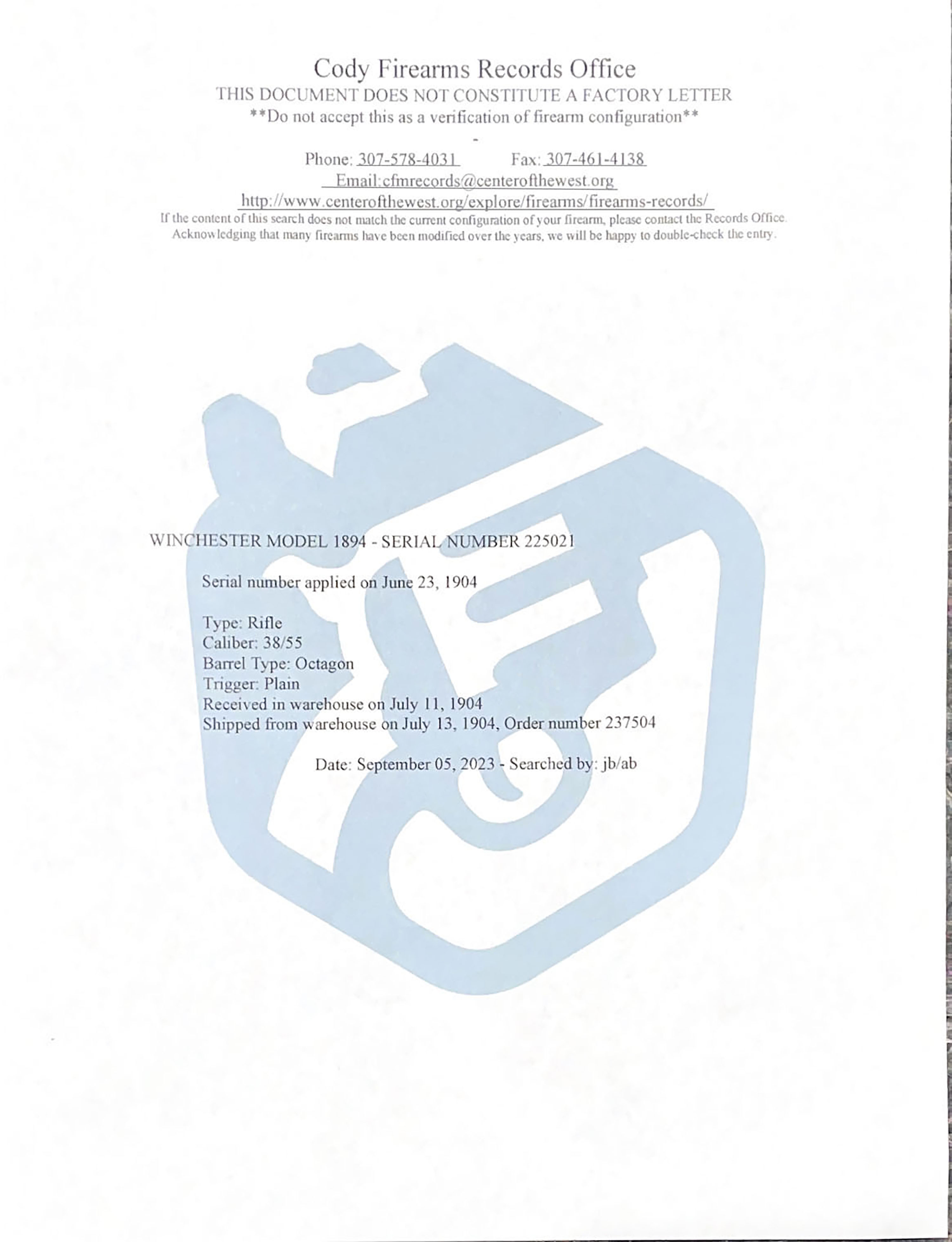 Winchester, Model 1894, CAL: 38-55, MFG: 1904, SN: 225021, Lever Action Rifle, 26'' Octagon Barrel, Full mag. The original wood stocks are excellent, with a few light handling marks, scuffs & contusions to the original excellent finish. There is a larger 1'' contusion on the left side of the stock. The original factory blue is 98% overall, with additional loss on the lever &belly. Bore is excellent, but with a few tiny abrasions amongst strong rifling at muzzle end. Barrel fitted with factory adjustable rear sight & standard front sight. Metal crescent buttplate. Tight smooth action. Comes with a Cody Winchester Factory Records Look-up Sheet confirming configuration & dates. An overall excellent original condition rifle & highly collectible.* FFL or C&R Req. - Value: 3000 to 5000