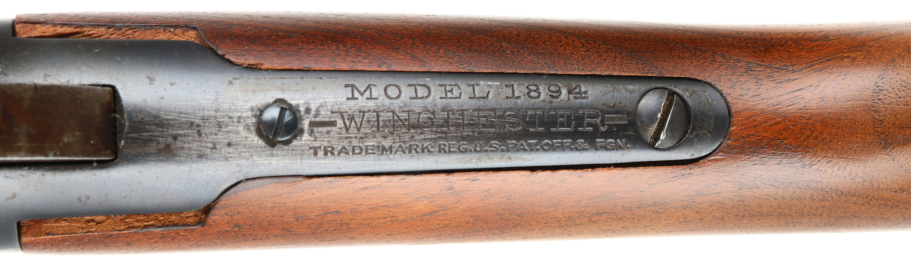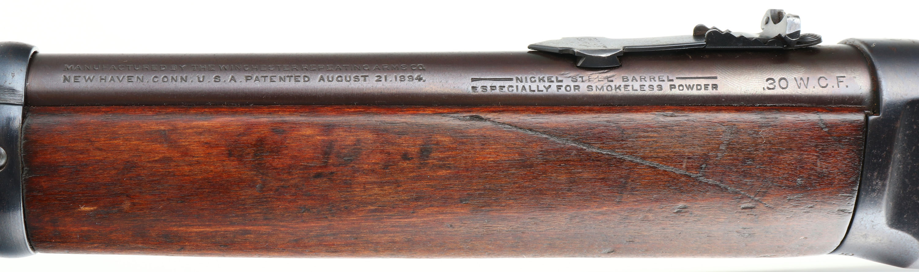 Winchester, Model 94 Saddle Ring Carbine, CAL: 30 WCF, MFG: 1917, SN: 870125, Lever Action Carbine, 20'' Round barrel, Full mag. The straight grip wood stocks are excellent & solid, however the stock appears to be a later Winchester 94 stock. There are missing slivers on both sides at the upper shoulder where the wrist meets the receiver. The stock has very few light handling marks to the original finish. The original forend has minor scratches, scrapes, & contusions to the original finish. The restored metal blue finish rates 98%, with the barrel having a bit of a plum tone. Bore is excellent. The barrel holds an adjustable Marbles buckhorn rear sight & carbine box front sight. Stock carries a checkered metal shotgun buttplate. Original saddle ring. Smooth tight action. Has a very nice overall appearance & should be a great shooter. FFL or C&R Req. - Value: 600 to 1200