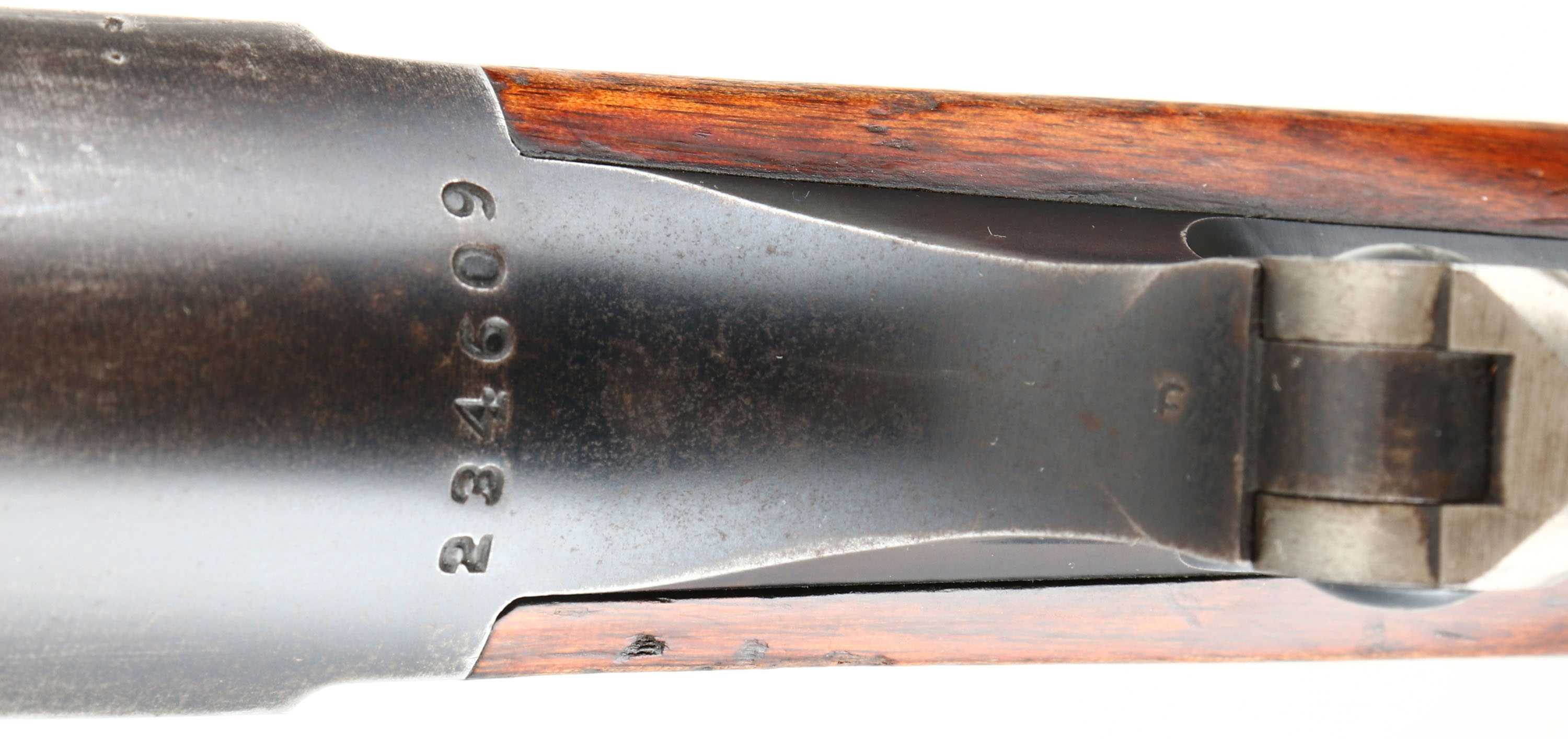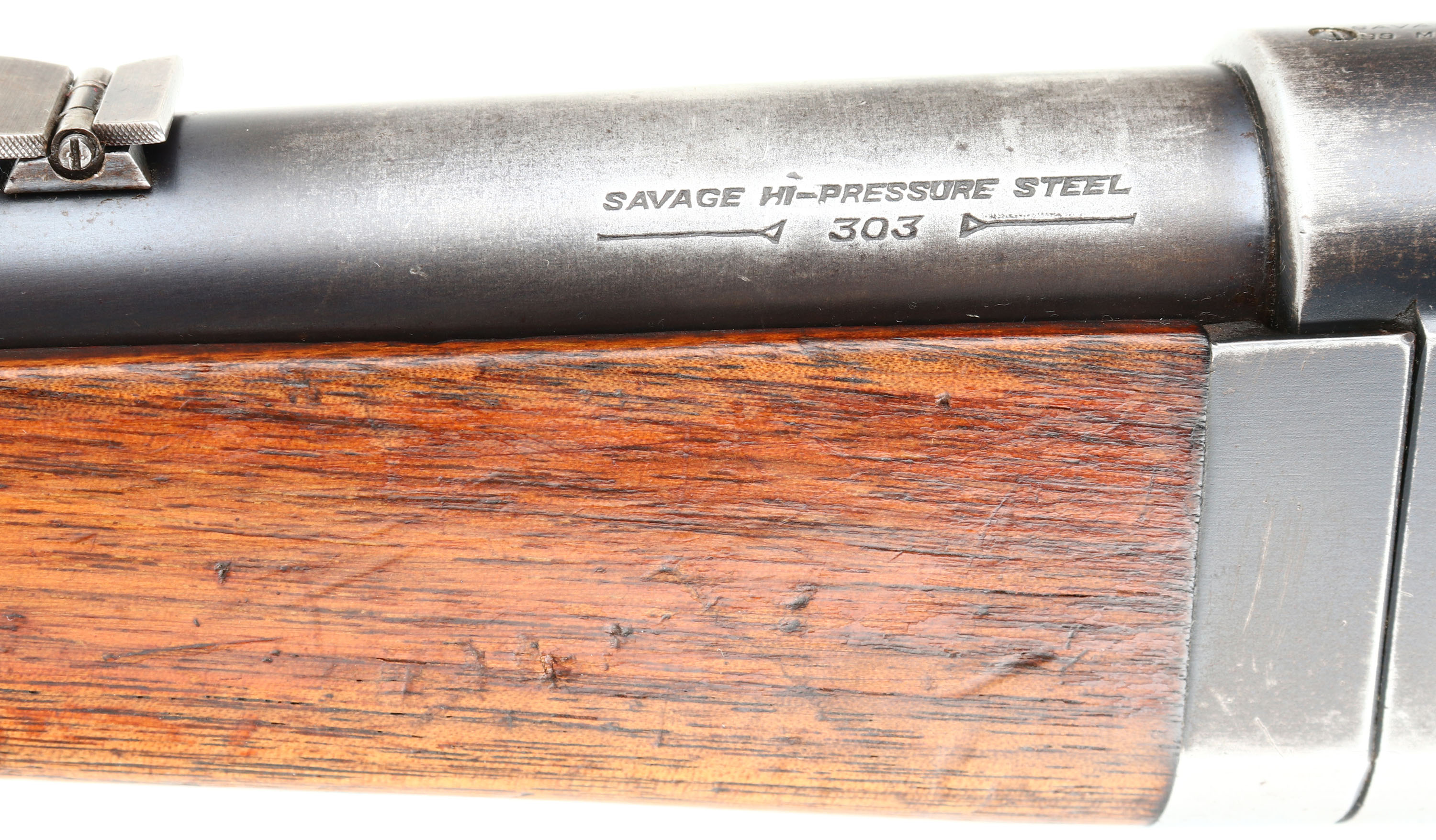 Savage, Model 1899, Take-down, marked 303 Cal., MFG: 1921, SN: 234609, Lever Action Rifle, 26'' Tapered round barrel. The factory straight grip wood stock & schnabel forend are very good & solid, with numerous small handling marks, scratches & contusions to the original finish. There is a small chip at the toe. The original blue finish rates 75% on the barrel, 60% on receiver, with most wear found on the belly. The lever displays faint remains of case-coloring. The stock carries the original Savage serrated metal buttplate. Barrel fitted with a two leaf folding rear & tall blade front sights. Bore is very good. Top of receiver carries 4 filler screws from previous scope mounting. Action is smooth & tight. Nice overall appearance. FFL or C&R Req. - Value: 600 to 1200