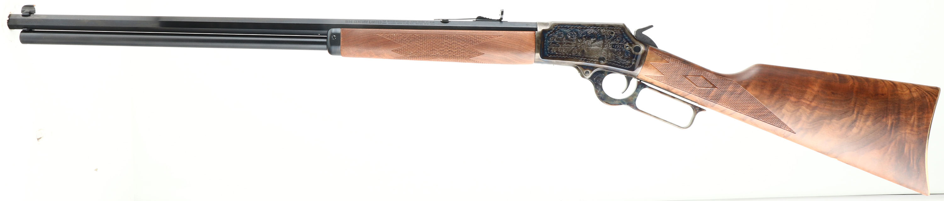 NEW BOXED, Marlin, 1894 Century Limited, 100 Year Anniversary (1894CNLTD). CAL: .44-40, MFG: 1994, SN: 94CL0716, Lever Action Rifle, 24'' Octagon barrel. Full Mag. Both sides of the case-hardened receiver & lever feature foliate engraving. The left side of the receiver has ''Century Limited 1894-1994'', an engraved buck, & signature of engraver ''Bottega C. Giovanelli'' at the bottom. The right side has the Marlin horse back rider engraved. The upper tang is marked with the serial number. The top of the receiver has foliate engraving & is marked ''MARLIN SAFETY''. The stocks are two-piece checkered walnut with an oiled finish, capped forearm, straight grip & comb, & a crescent brass buttplate. The buttstock has the ''Marlin Bullseye'' in the belly. The metal blue finish rates 100% overall. The receiver displays vivid case-colors. Bore is mint. Barrel carries factory buckhorn rear & front blade sights. Comes in original matching box, with packaging & paperwork. NOS. A fantastic commemorative rifle. FFL Req. - Value: 1000 to 2000
