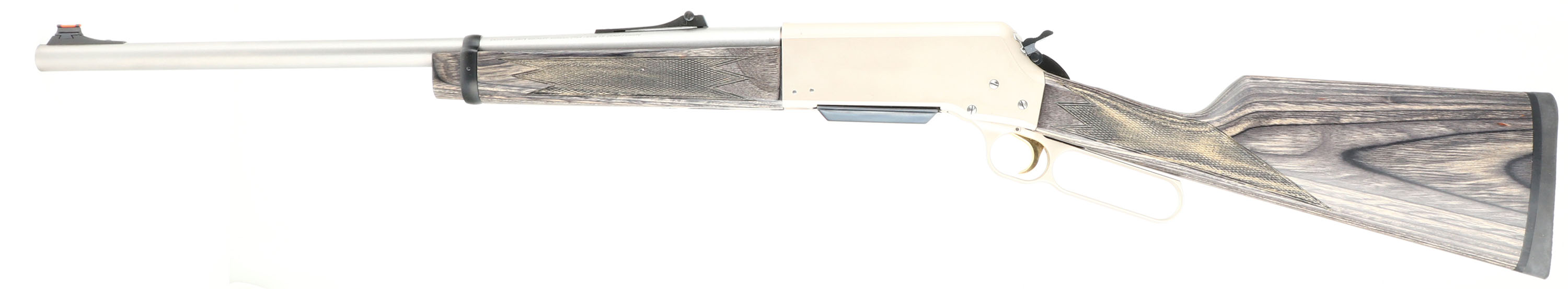 Boxed & NEW Browning, Model BLR 81 Lightweight, Marked .450 Marlin, Cal., MFG. Modern, SN: 01812ZW341, Lever Action Rifle, 20'' round barrel, Detachable 4 round box mag. Original factory checkered gray laminated wood stocks are excellent, with mint original finish. The original stainless steel barrel & satin gray receiver finishes are 100%. Bore is mint. Factory rear & fiber optic front sights. Original black solid recoil pad. Gold Trigger. Rifle comes in correct SN matching box, with packaging & booklet. Essentially a NIB Browning lever. FFL Req - Value: 600 to 1000