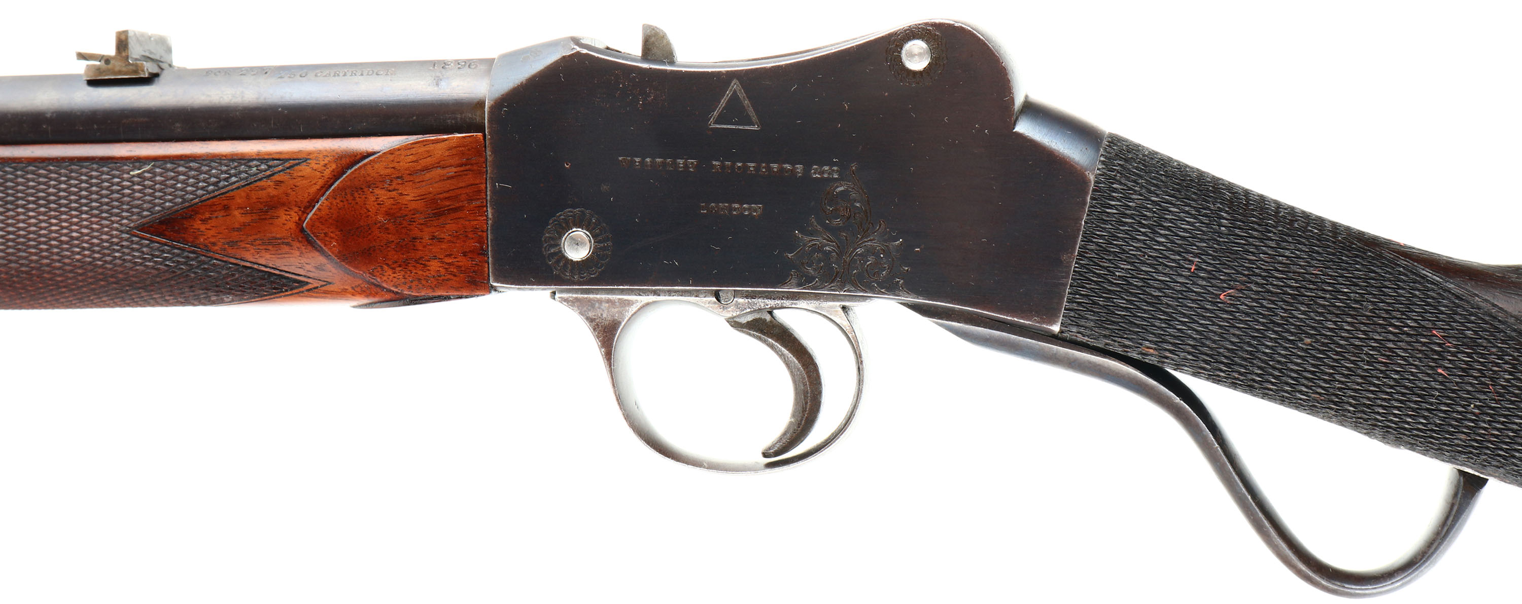 Westley Richards & Co., Sherwood Miniature ''Rook'' Rifle, CAL: 297/250 Rook, MFG: 1880's -1910, SN: 1896, Lever Action Breech Loading Rifle, 26 3/8'' barrel. This example is a small lightweight takedown rifle which used an improved Martini action chambered in the small ''Rook'' caliber. It makes an ideal rifle for small game hunting & target shooting. This unique British sporting firearm features a Detachable Barrel/Action patent. The left side of the barrel is marked ''WESTLEY RICHARDS & CO LONDON'', ''FOR 297/250 CARTRIDGE'', followed by ''1896''. The right side of the barrel is marked ''PATENT DETACHABLE BARREL 112''. The left side of receiver is marked ''WESTLEY RICHARDS & CO LONDON'' & the right side is marked ''IMPROVED DETACHABLE PATENT NO. 97111''. The original checkered straight grip wood stock with ebony forend tip is excellent, having been professionally refinished. There are minor contusions & handling marks to the finish. The original metal blue finish rates 90% overall, with intermittent spotting & speckling toned to a brown patina. The receiver displays ornamental scroll & accent engraving. Bore is good & bright, with intermittent pitting amongst proud rifling. The matted rib holds a two-tier folding leaf rear sight & blade front sight. Stock carries a checkered plastic buttplate, with squirrel vignette. Comes with (45) loaded rounds of .297/250 Rook, (53) unprimed brass cartridges & a 3 Die Set 297/250 Rook.* Antique, No FFL Req. - Value: 2000 to 3000