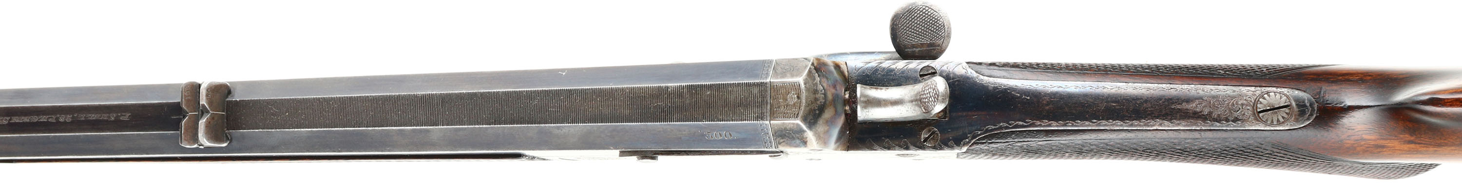 Peter Small, Rook Rifle, CAL: .300 Rook, MFG: N/A, SN: 66236, Side Lever Break Action Single Shot Rifle, 26'' octagon barrel, Partially Matted. The barrel flat is marked ''P.SMALL.28 PILGRIM ST NEW CASTLE ON TYNE''. The original checkered & capped pistol grip stocks, with ebony forend tip, are excellent, having been professionally restored. There is a blank oval nameplate on the belly. There are minor contusions & handling marks to the excellent finish. The original metal blue finish on the barrel rates 85%, with the edges showing loss. The case-hardened receiver & pistol grip cap still display vivid case-colors, while other areas have faded to metal gray. Fantastic scroll & accent hand engraving found on receiver back of barrel, trigger guard, pistol grip & small medallion inlaid into forend. Bore is excellent, but with light intermittent spotting amongst strong rifling. The barrel holds a 3-tier folding leaf rear sight & a blade front sight. Manufactured without a buttplate, but with serrated buttend. Comes with a full box of .300 Rook 90gr Ld FL PT ammunition.* FFL or C&R Req. - Value: 2000 to 3000
